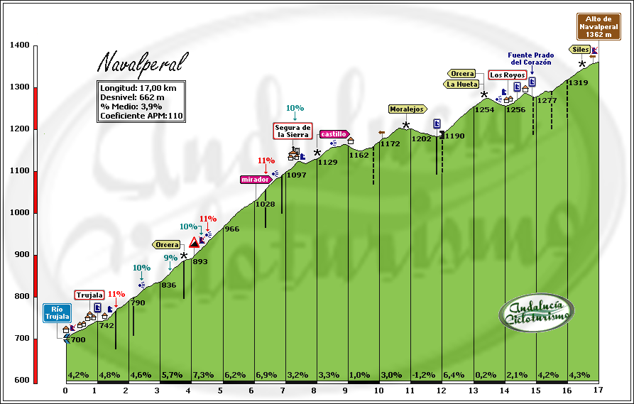 De una considerable longitud, este alto de Navalperal (como lo hemos denominado) podemos dividirlo en dos partes bien diferenciadas: de un lado, unos primeros 7,5 km. de subida continua entre el 4 y el 7% hasta Segura de la Sierra; de otro lado, un tramo largo, irregular, con constantes repechos y descansos hasta coronar a 1.362 m. de altitud.