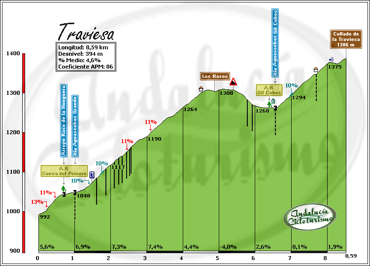 Al llegar a Los Rasos disfrutamos de un falso llano seguido de un fuerte descenso -advertido por una señal del 10%- que nos va a situar en el Área Recreativa “Gil Cobos”. Precisamente al atravesar el río Aguascebas de Gil Cobos, retomamos el ascenso a lo que será el tramo continuado de mayor dureza del puerto. Se trata de algo más de un km. que supera el 8% de pendiente media, aunque las rampas serán homogéneas en todo momento. Al final de una recta vemos ya el collado, aunque a nuestra derecha, en la ladera opuesta a la que nos encontramos, distinguimos una carretera. Tras un momento de incertidumbre, pronto salimos de dudas: la carretera evita el collado natural en un giro a derechas y sigue subiendo aún durante unos cientos de metros.