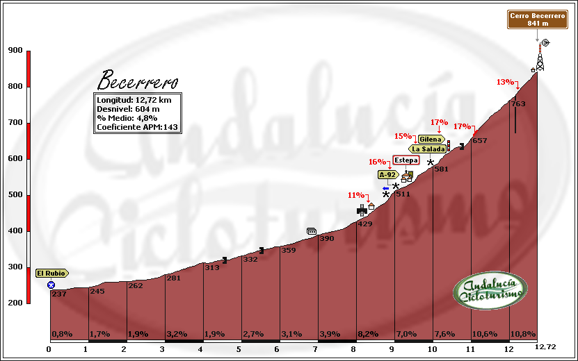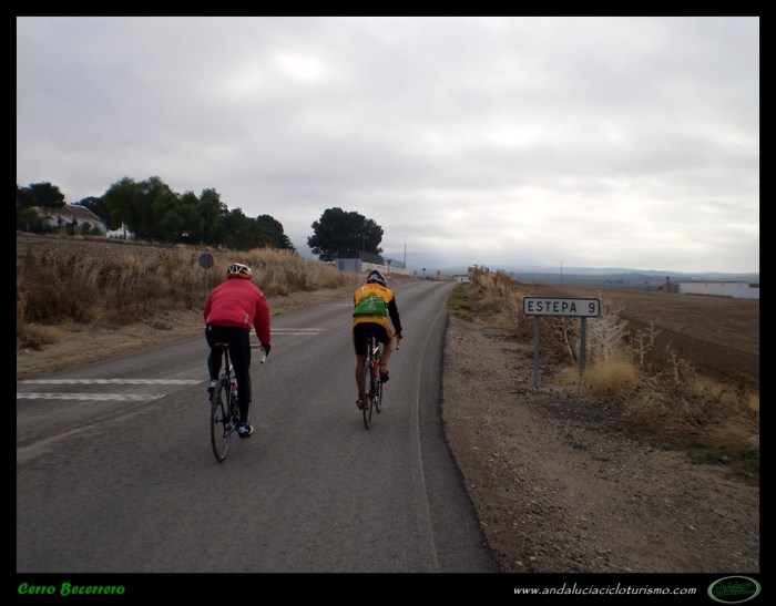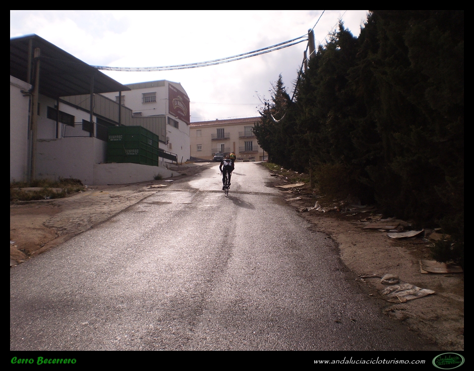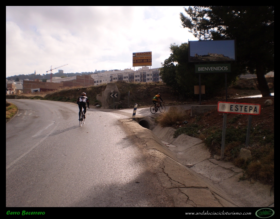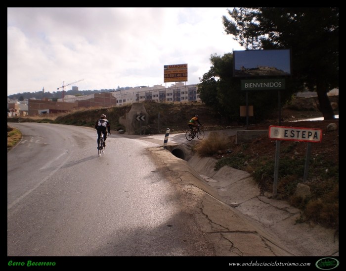 Siempre entre olivos y con Estepa al frente, transitamos bajo el puente de la A-92, momento en que acontece un brusco cambio en la subida: en primer lugar, las rampas se endurecen hasta situarse por encima del 10%; en segundo, tras realizar un giro a la derecha y superar unos 300 m. con rampas de hasta el 16% junto a un polígono industrial, nos introducimos de pleno en la travesía del pueblo.