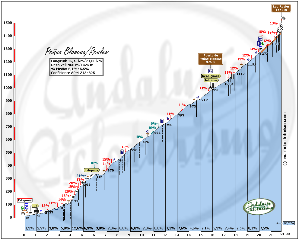 Consejos y sugerencias: de inicio engañoso, cuando la carretera se empina lo hace de verdad. Sus 15 km. finales, pese a los descansillos, mantienen una pendiente bastante constante y siempre próxima al 7% de media. El calor y la humedad suelen aliarse en nuestra contra.