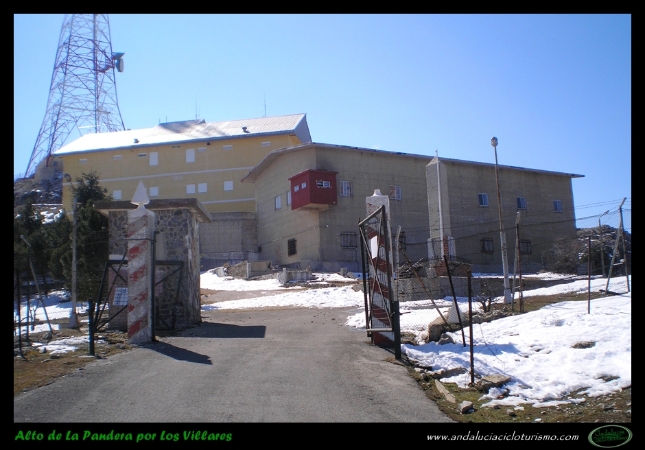 Un repecho en fuerte descenso nos sitúa al pie del verdadero Alto de la Pandera coronado por una enorme antena y con las antiguas instalaciones militares ya a la vista. Esta base de radares fue construida por los americanos en los años cincuenta del pasado siglo para la vigilancia aérea y al correr de los años pasó a manos del ejército español, titular de la misma. Actualmente las instalaciones, toda vez que el radar opera por control remoto, han sido cedidas a los ayuntamientos que comparten el espacio de la cima de la Pandera, por lo que probablemente se les acabará asignando un uso turístico. Precisamente a la promoción de la zona debemos el que la Vuelta Ciclista a España haya ascendido en varias ocasiones hasta aquí arriba.