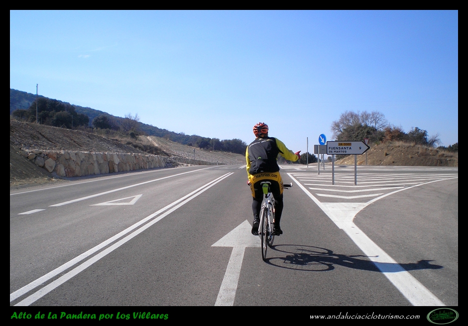 Es puerto viejo un cruce de tres caminos, el que traemos, el que dejamos a la derecha hacia Fuensanta de Martos y Martos mismo, y el que seguimos camino de Valdepeñas, inicialmente, y al fin de La Pandera, cuya cumbre atisbamos perfectamente con antena incluida. De descenso hay poco y sin apenas pendiente, continuado pronto por un falso llano de dos kilómetros y todo ello a través una carretera ancha, recién remozada y de nuevo trazado.