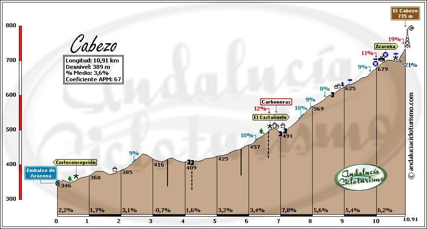 Consejos y sugerencias: la carretera desde el embalse de Aracena hasta el propio pueblo es una cuesta de cómodo ascenso, sólo el repecho final hasta la antena de El Cabezo cuenta con rampas serias de verdad, además de un asfalto en malas condiciones, por lo que hay que cuidarse de no perder el equilibrio.