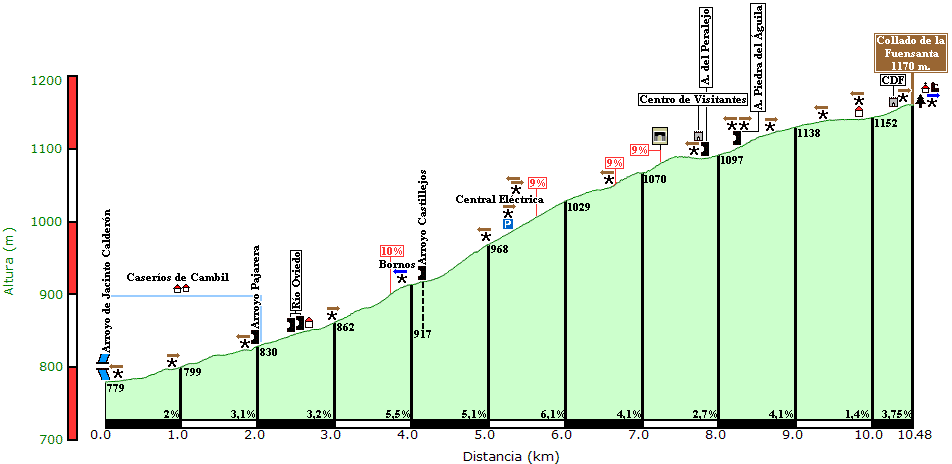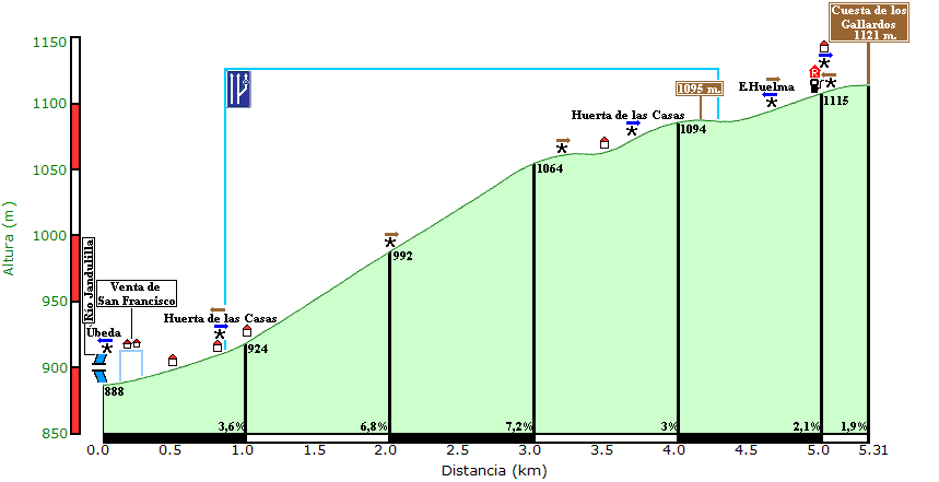 Como puede verse, una vez que se ha eliminado el paso por La Guardia de Jaén, los cuatro puertecillos –que bien podrían haberse puntuado de tercera- suman un desnivel acumulado de 1171 m. que, a buen seguro, se dejarán notar en las piernas cuando llegue el momento cumbre de la etapa».