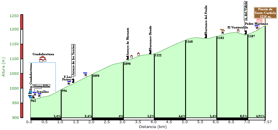El quinto es el puerto de Torre Cardela, con APM 36, longitud 7,57 km, media 3,34% y desnivel 253 m.