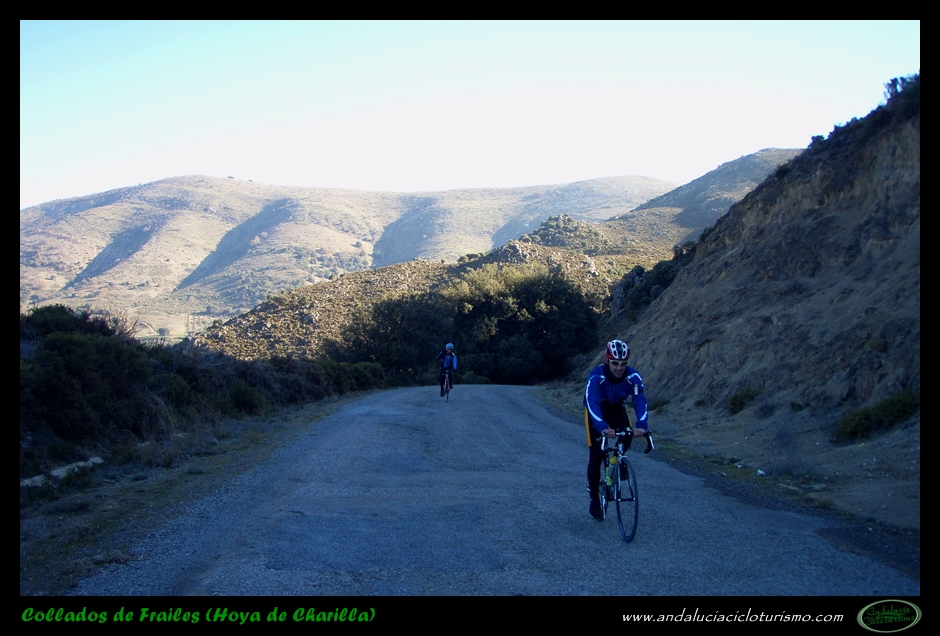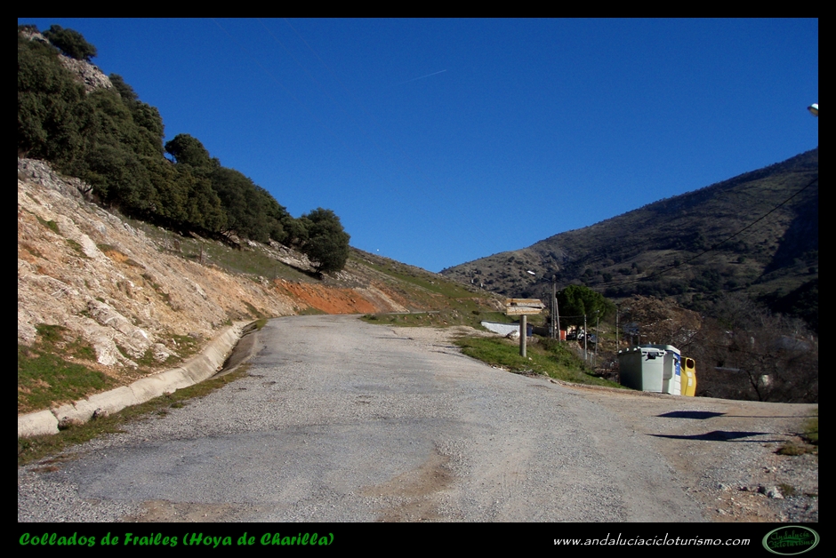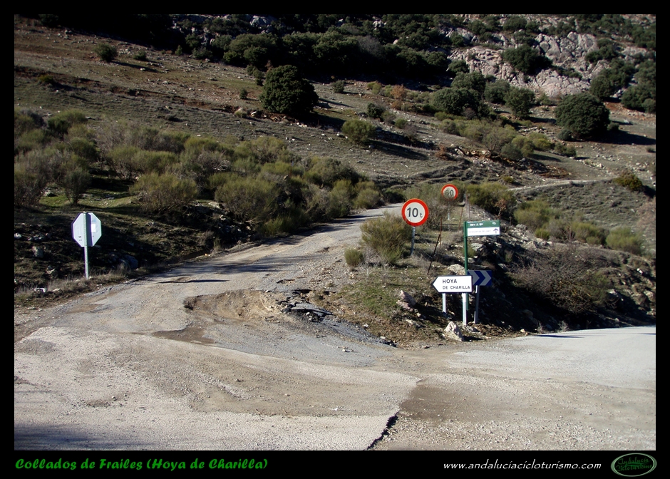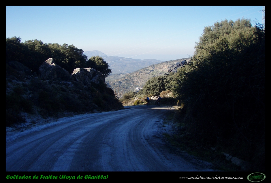 Tras infinidad de chepazos y una postrera rampa al 21% atisbamos el final de la cuesta en su parte inicial y más dura. En una curva a derechas coronamos el mencionado Portillo de Alhucema y comenzamos un descenso con fuerte pendiente y, sobre todo, asfalto irregular en cuyas postrimerías nos adentramos en La Hoya.