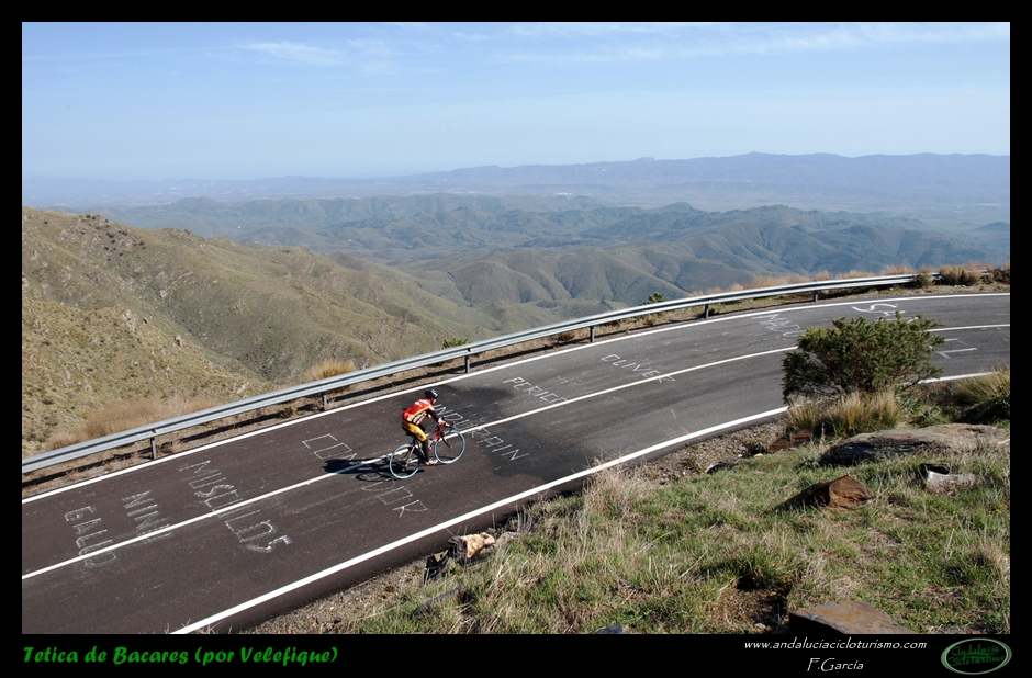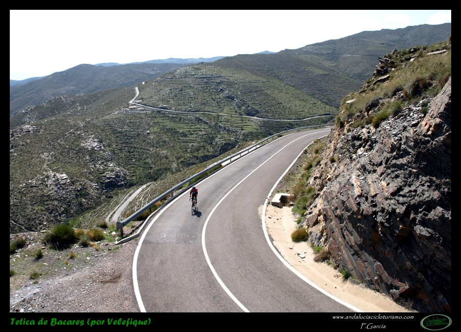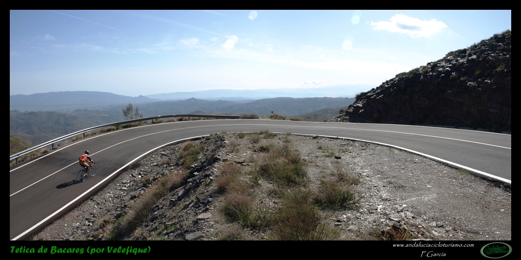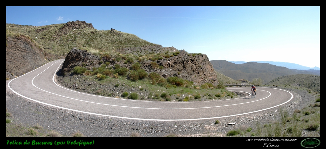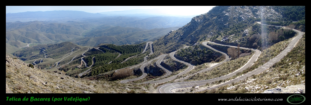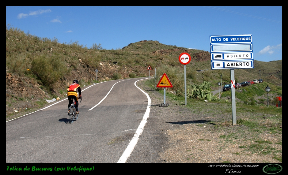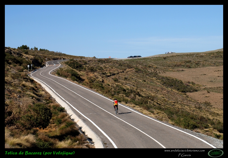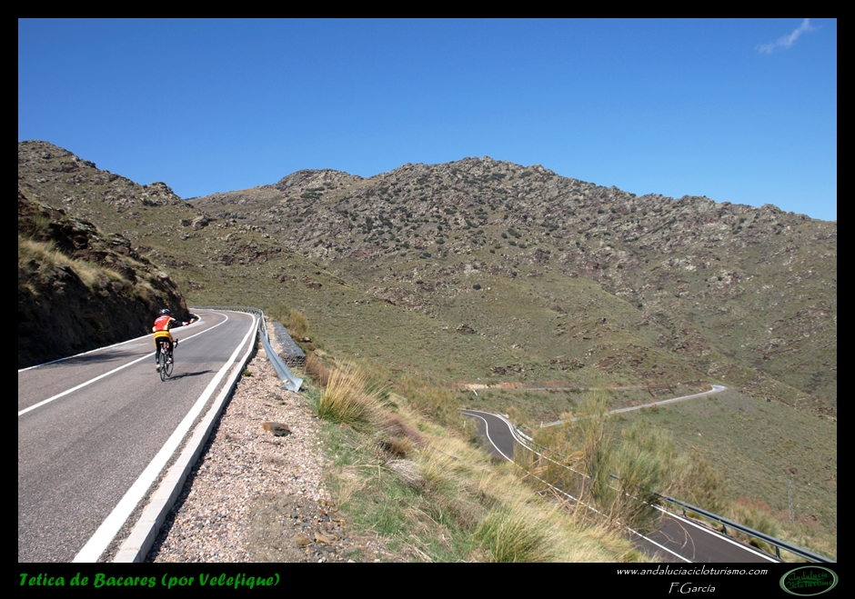Por lo demás, entrando ya en lo que nos atañe, la carretera del puerto de Velefique y su prolongación a la Tetica de Bacares son, a nuestro juicio y sin temor a equivocarnos, una de las vías más escénicas de Andalucía, cuando no de toda España. Y, por si éste fuera poco aliciente para subirlo, el puerto además se las trae: 23,65 km. de ascenso para 1.400 m. de desnivel y 2.074 m. s. n. m., un auténtico “puerto Tour” como gustamos de llamar los aficionados a subidas de tal envergadura.