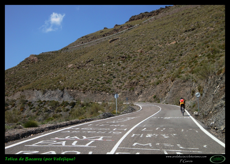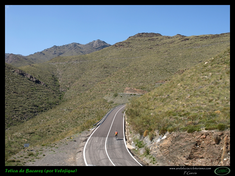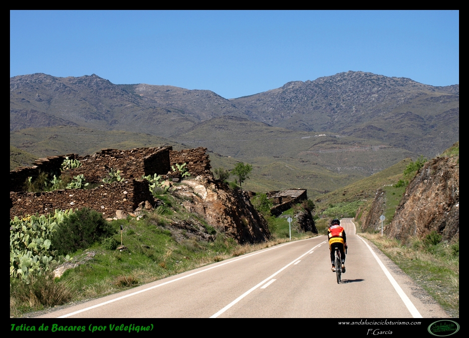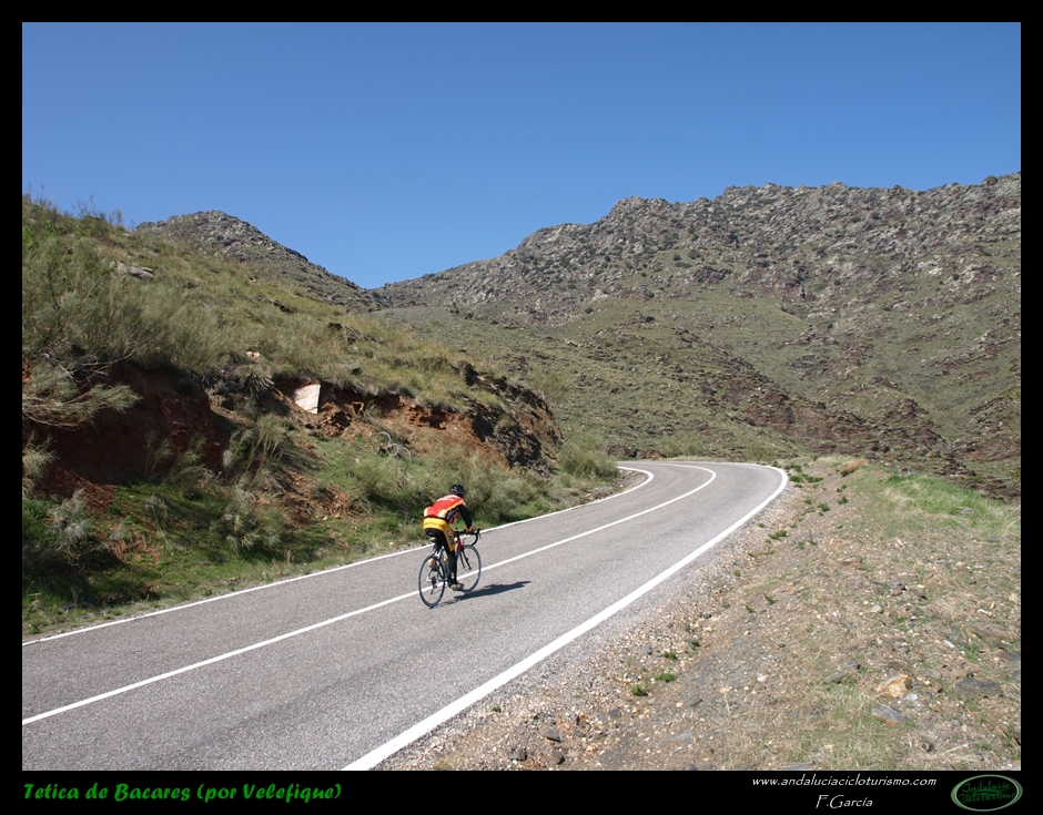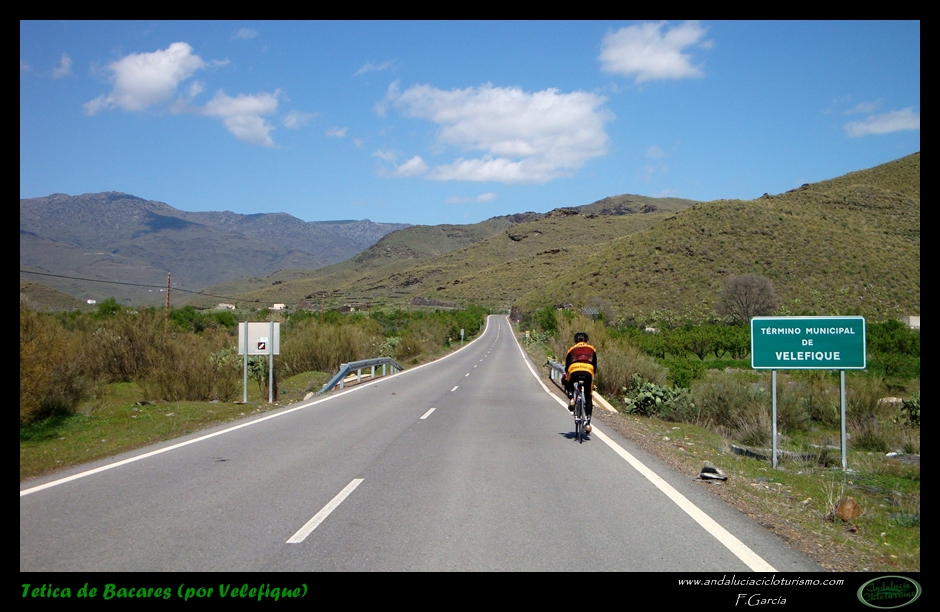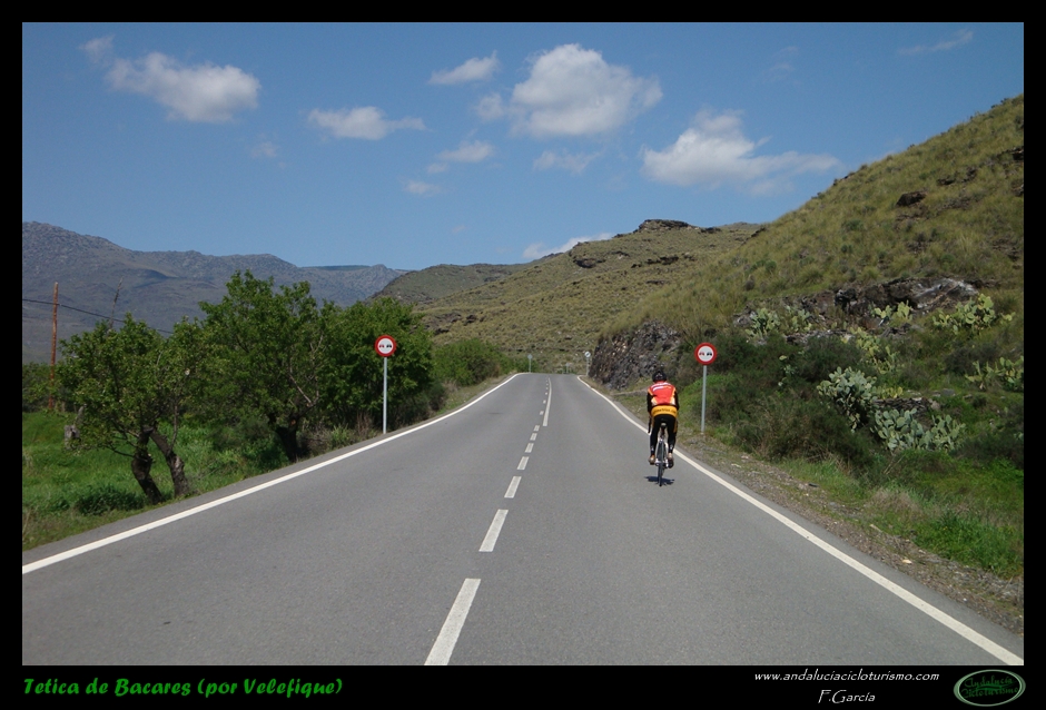 Si venimos desde Tabernas, nuestras piernas habrán notado cómo hasta llegar a este punto la carretera, lejos de llanear, sigue una tendencia siempre ascendente, de forma muy suave, pero constante. Pues bien, dicha tendencia se acentúa ligeramente a partir de la mencionada rambla hasta que, pocos kilómetros más tarde, en las inmediaciones de Velefique, muda definitivamente en franca cuesta.