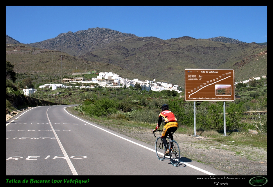 Antes de llegar a la población, que ya se muestra a la vista, un gran cartelón, el único de estas características con que nos hemos topado en las carreteras andaluzas hasta la fecha, nos muestra el perfil del puerto de Velefique. Así que, si no tenemos sus datos grabados en la cabeza, un vistazo nos vendrá bien para saber a qué atenernos.