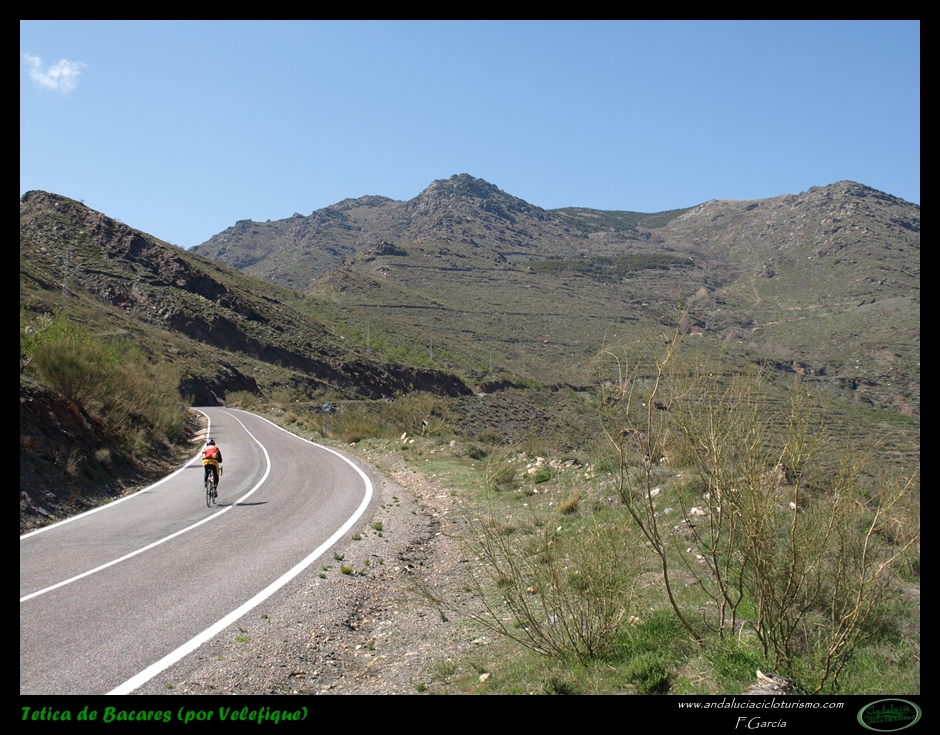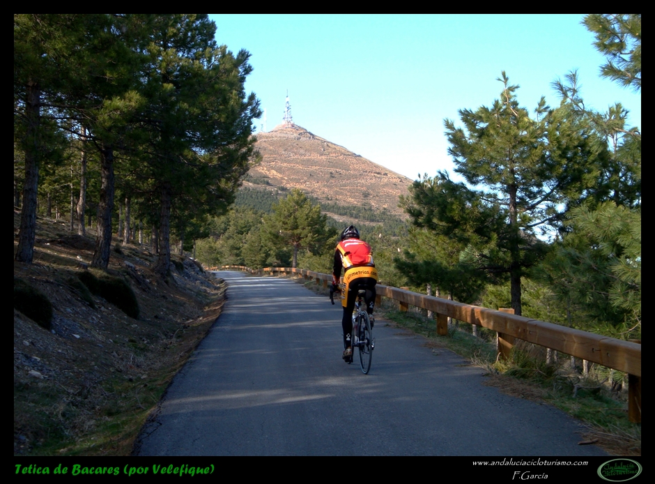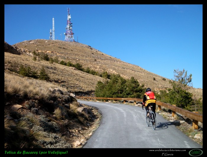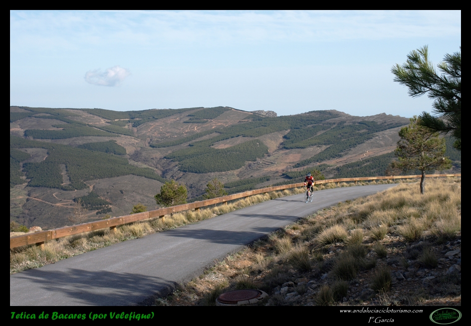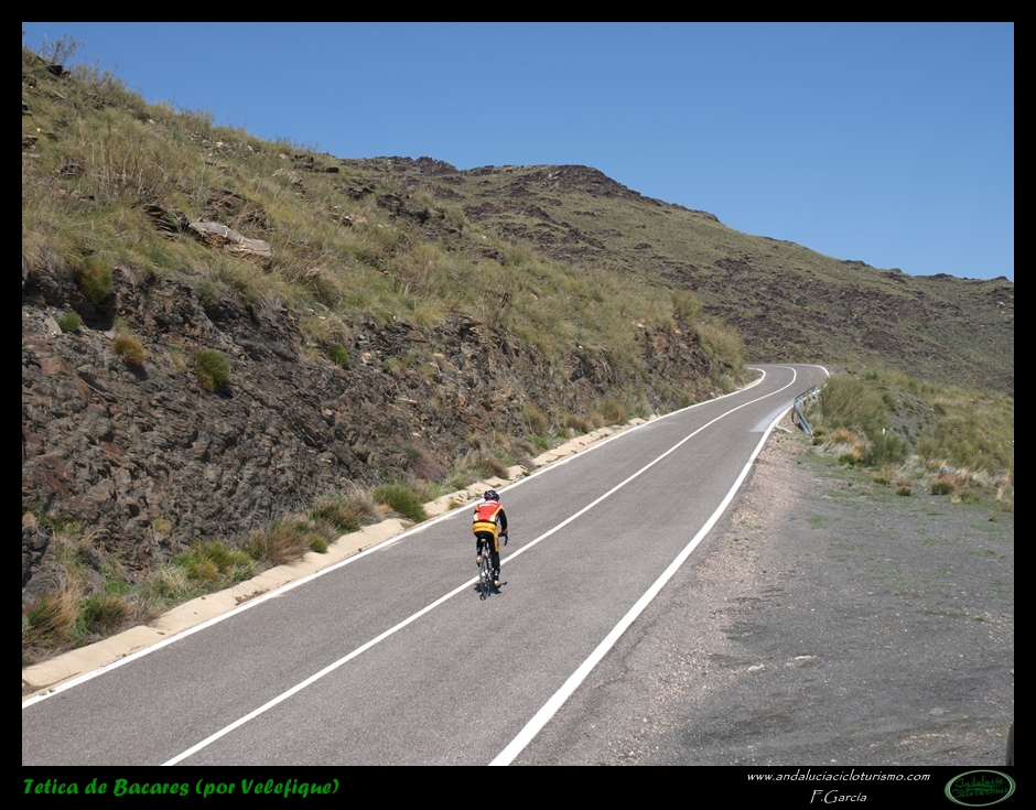 Al abandonar la carretera de Bacares, aún gozaremos de unos últimos instantes de reposo previos a la faena final abrigados por la sombra de un pinar. Luego la carretera, más estrecha pero en perfectas condiciones tras ser remozada pocos años ha, irá empinándose paulatinamente hasta que se nos acabe la montaña. Se nos resistirá esta última conquista a buen seguro, puesto que, largo y duro, el puerto termina por pasar factura y los desfallecimientos no serán ajenos ni siquiera a los más atléticos pedalistas.