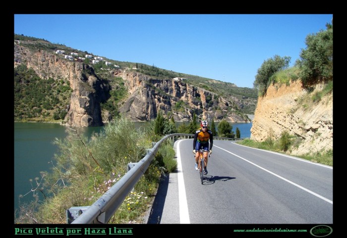 Bajamos raudos, deseosos de poner a prueba nuestra capacidad escaladora, camino del puente sobre el río, en la cola del embalse de Canales. Desde aquí hasta la cima del Veleta nos separan poco mas de 31 km. al 7,8% de pendiente media… Sobran las explicaciones. Pero serán los siguientes 5 km. al 11% nuestra inmediata y principal preocupación.