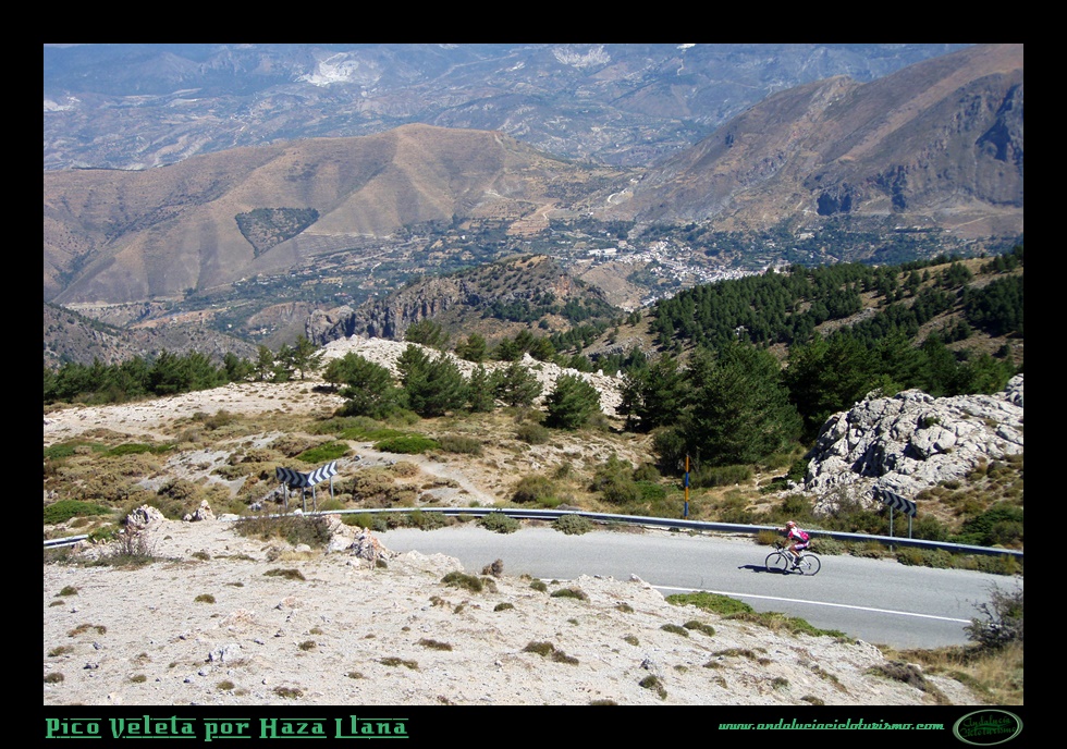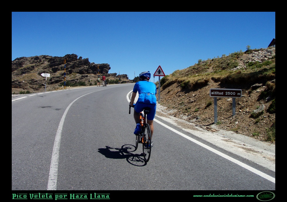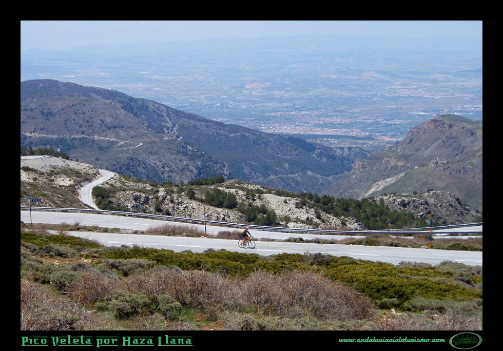 Más tarde caerá la también señalizada cota de los 2.000 m. con unas magníficas vistas hacia La Vega granadina y luego enlazaremos las últimas y espectaculares herraduras antes de coronar el Collado de Las Sabinas, hasta donde llegamos después de 24 km. Pero antes el Veleta vuelve a asomarse tras una curva a izquierdas… Aún está demasiado lejos.