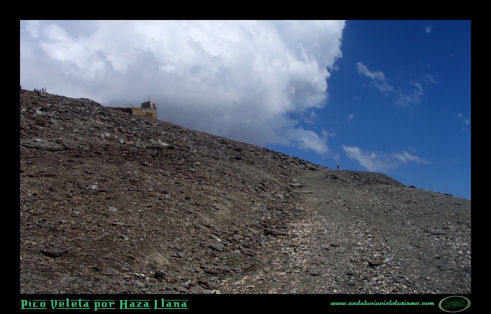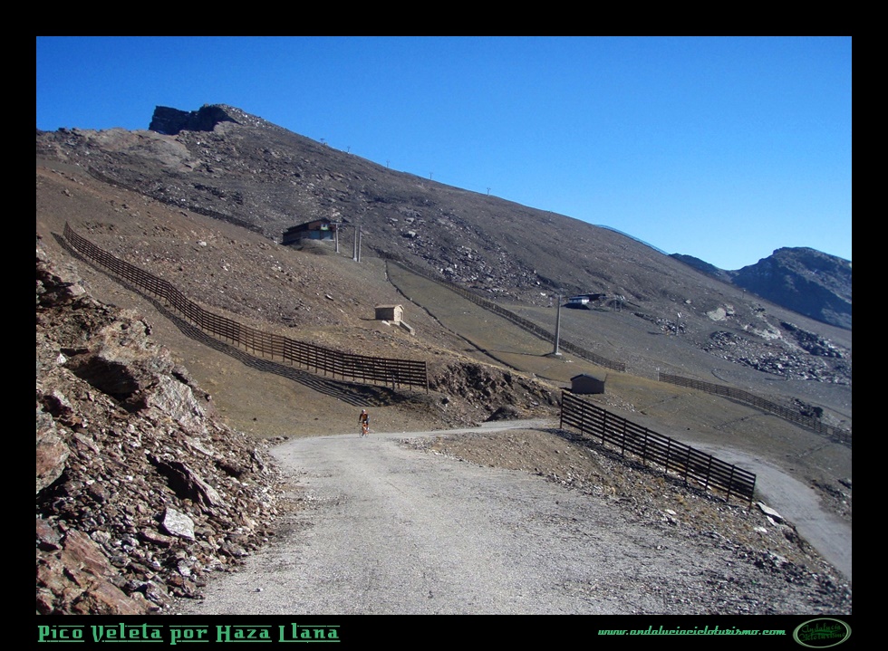 Coronado el Collado de las Sabinas a 2.173 m. después de un agradable falso llano, llegamos a un cruce en el que podemos desviarnos hacia la estación de esquí en descenso o seguir subiendo sin tregua hasta el Veleta. Escogida la segunda opción, nos vamos a topar con el que fuera Albergue de las Sabinas, hoy restringido a uso militar, por una carretera en excelente estado –como las anteriores- y que da continuidad a las pendientes previas al collado con kilómetros y kilómetros que siempre rondan el 7% cuando no lo superan.