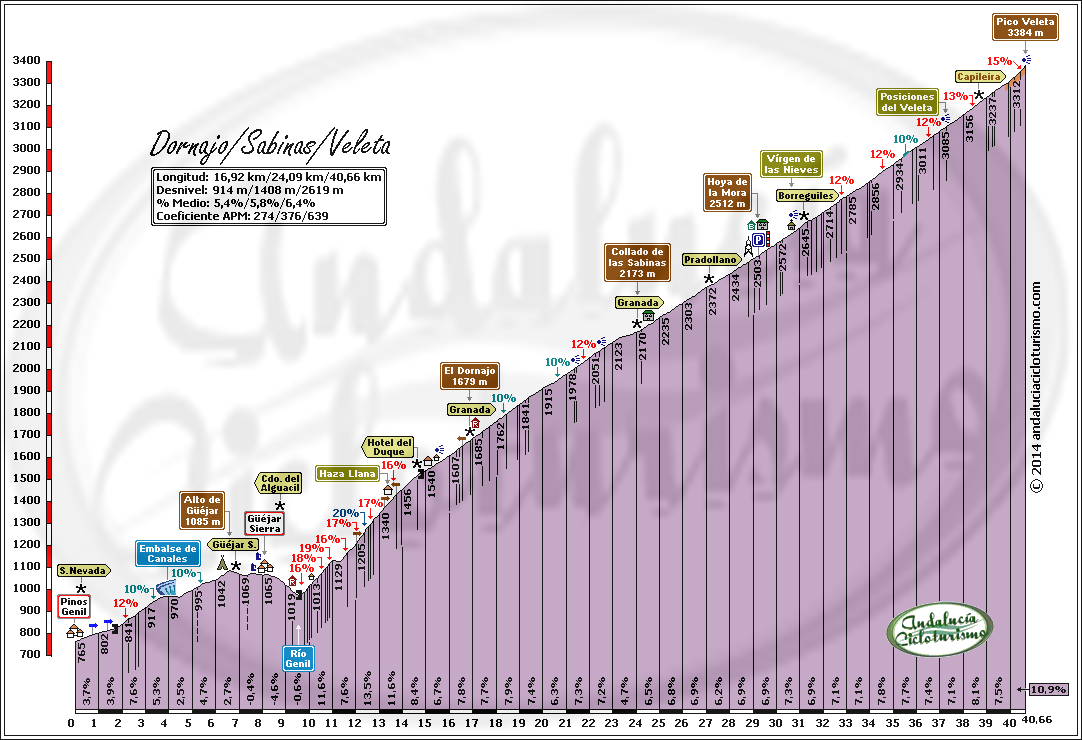 Para esta ocasión nos decantamos, como decíamos arriba, por la opción de mayor dureza o, al menos, eso es lo que nos ha parecido a nosotros a tenor de la pendiente media de algunos kilómetros y las puntas máximas alcanzadas. El inicio lo hemos situado en Pinos Genil, a la entrada del pueblo, inmediatamente antes de girar a la izquierda en el cruce de la carretera de Güéjar Sierra. También habría sido correcto, a tenor del descansillo existente a la entrada y salida del pueblo, considerar más adecuado como punto de inicio el puente sobre el río Genil, prácticamente en la cola del embalse de Canales. En ese caso, téngase en cuenta que los números del puerto son, si cabe, menos engañosos: 31 km. al 7,8% de pendiente media. Ni en el Tour de France, ni en el Giro d’Italia recordamos un puerto de números similares. Tal es su magnitud que el bien afamado Pico de las Nieves, citado a menudo como el más duro de Europa –afirmación, cuando menos, atrevida- se queda cuatro kilómetros corto y casi un punto de pendiente media por debajo. Y ello, por supuesto, sin hablar de altitudes.