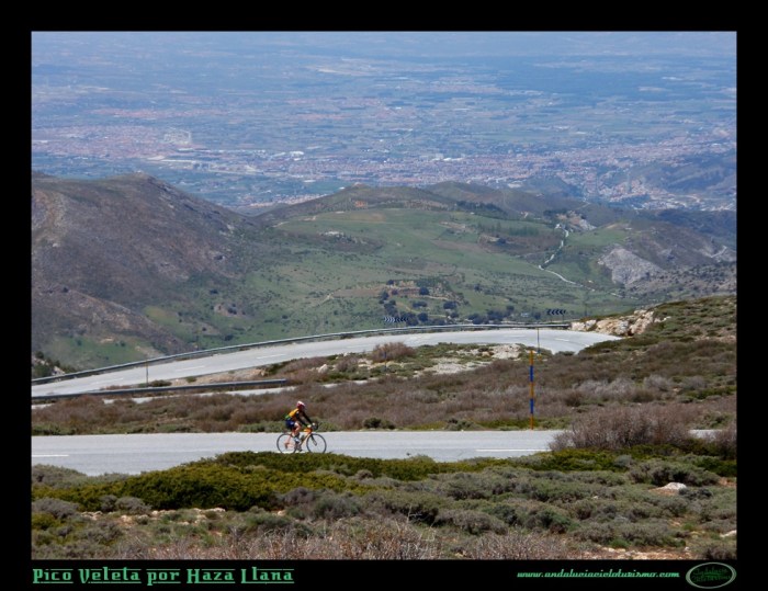 Más tarde caerá la también señalizada cota de los 2.000 m. con unas magníficas vistas hacia La Vega granadina y luego enlazaremos las últimas y espectaculares herraduras antes de coronar el Collado de Las Sabinas, hasta donde llegamos después de 24 km. Pero antes el Veleta vuelve a asomarse tras una curva a izquierdas… Aún está demasiado lejos.