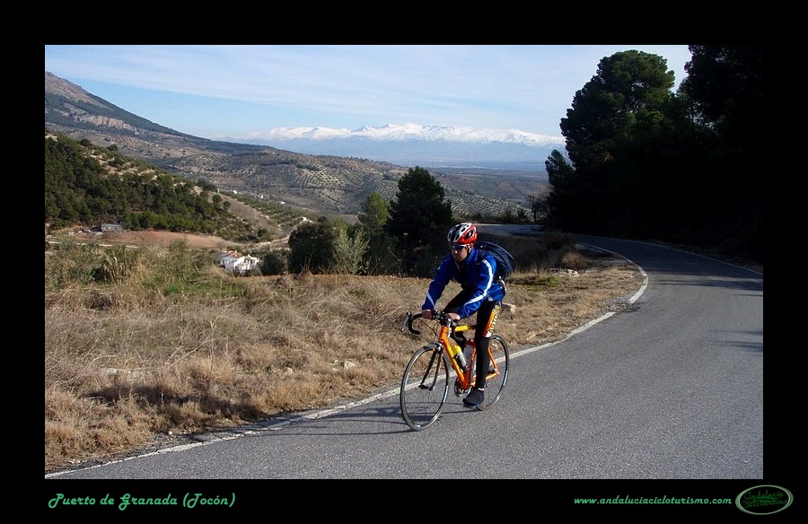 Al principio nos resulta el puerto bastante anodino –el olivar llega a saturar por momentos-, sin embargo a medida en que ganamos metros sobre Tocón la panorámica va mejorando, con las cumbres de Sierra Nevada como hermoso telón de fondo a nuestra derecha. Y las de las Sierras de Alhama a nuestras espaldas.