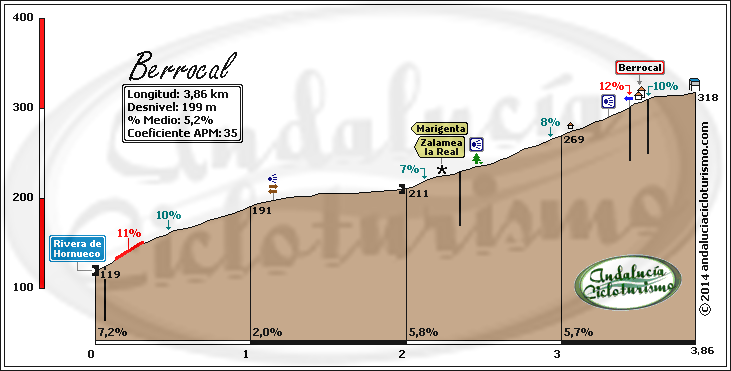 Por suerte, verdaderamente duros serán sólo unos 500 m. iniciales de fuerte pendiente, con una rampa mantenida al 11%, porque a partir del medio kilómetro la cuesta irá cejando paulatinamente hasta permitirnos un largo descansillo.