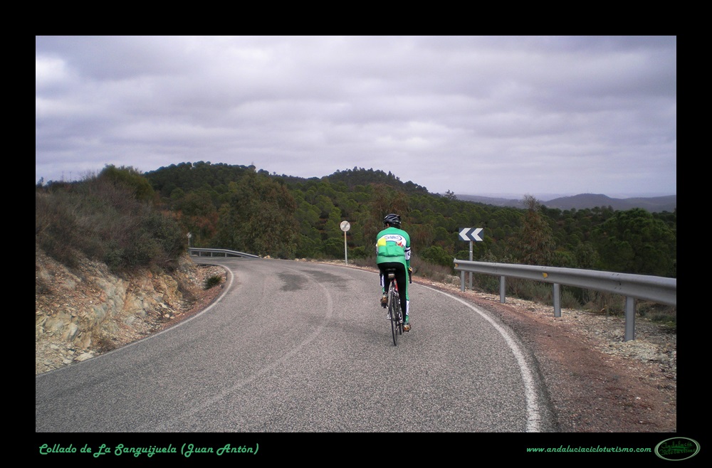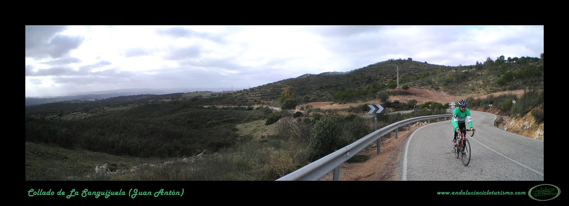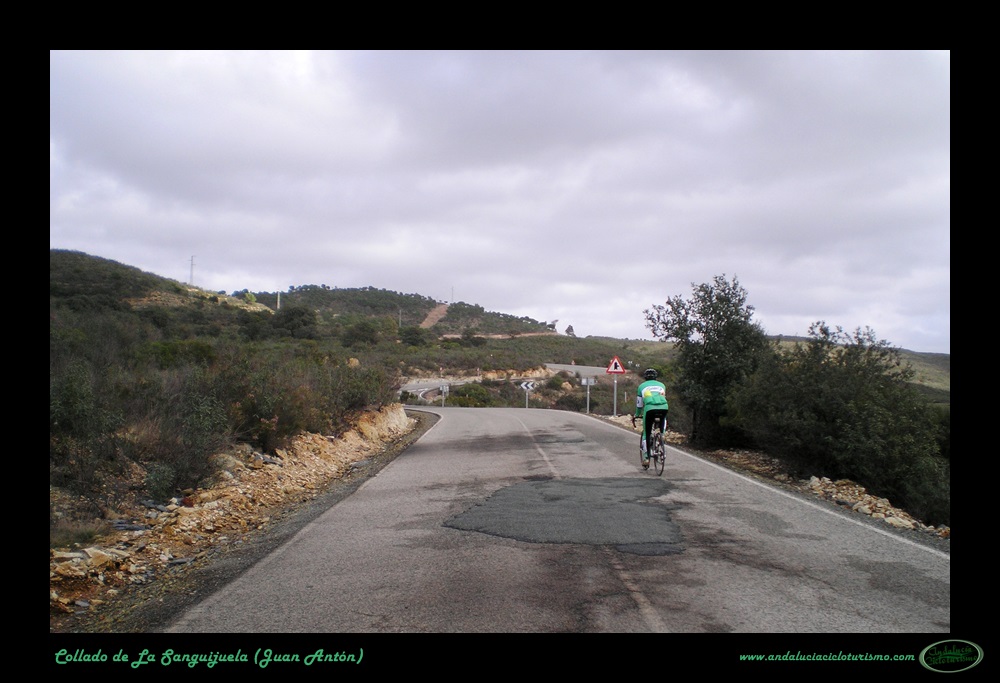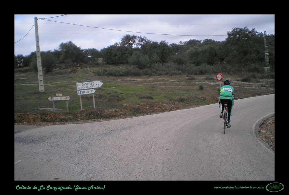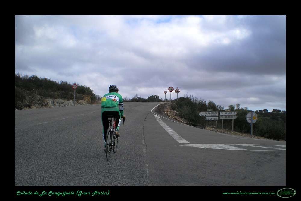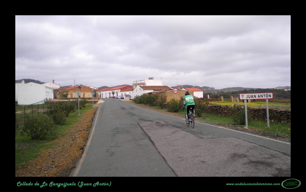 Llegamos a Juan Antón, una de las villas que forman el municipio de El Madroño, coronando al alimón un repecho. Tras una corta bajada proseguimos por una cómoda zona de suave subibaja hasta el cruce de El Álamo y Villargordo, punto éste en que la carretera vuelve a picar para arriba con algo de más intensidad. A media ladera, en un cerro, se muestra el trazado de la carretera en el que será el punto más escénico de toda la subida.