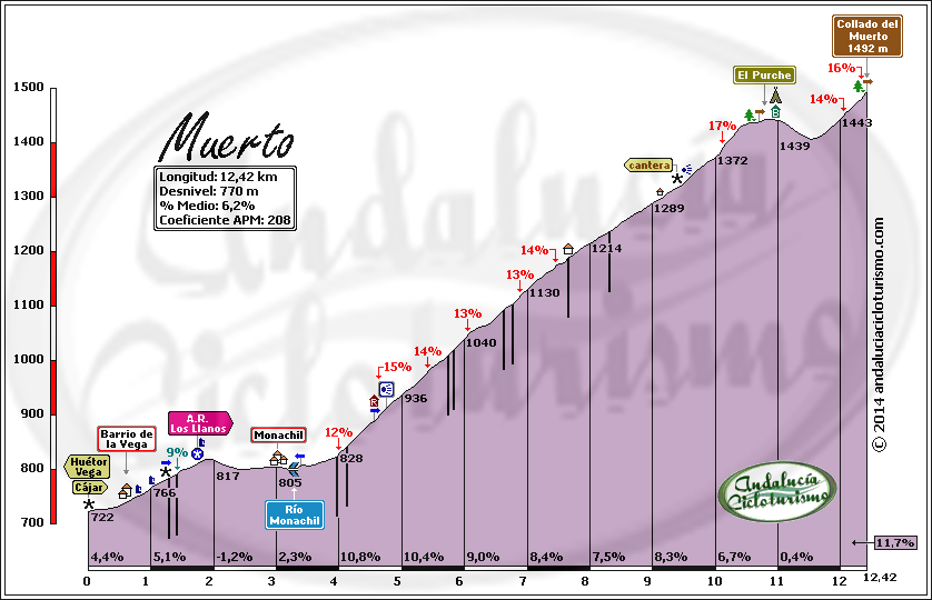 El puerto sube durante los primeros km. por el antiguo “camino de los neveros” que desechó el ingeniero Santa Cruz cuando se hizo cargo del proyecto de la construcción de la carretera del Veleta, un camino que con los años llegó a asfaltarse, siendo ya un clásico, como decíamos, entre los ciclistas aficionados y los profesionales que, desde su doble estreno en 2004, han tenido que padecer sus rampas en varias ocasiones.