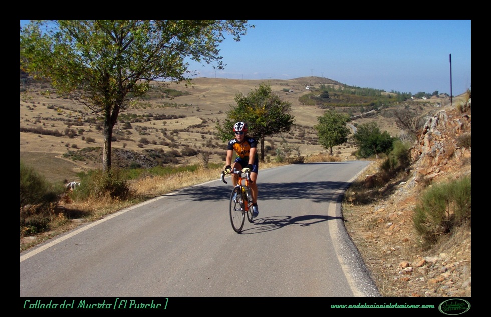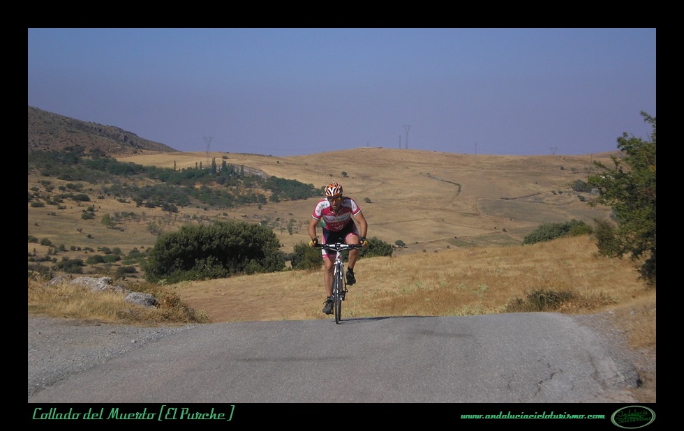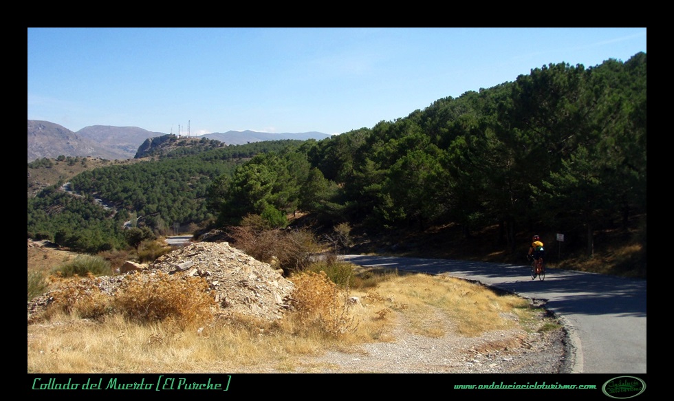 La vegetación comienza a ralear y el paisaje nos resulta un tanto desértico por momentos, tan sólo en algunas lomas próximas aparece arboleda más tupida. En efecto, a la derecha se encuentra la vecina barriada de Cumbres Verdes, con una arboleda que hace honor a su nombre. La pendiente se sitúa en algún momento al 15%, punto en el que dejamos de prestar atención a lo que nos rodea y nos centramos en la carretera. Al girar a la izquierda vemos frente a nosotros, loma arriba, cómo traza varias herraduras… Por suerte, aún estamos frescos.