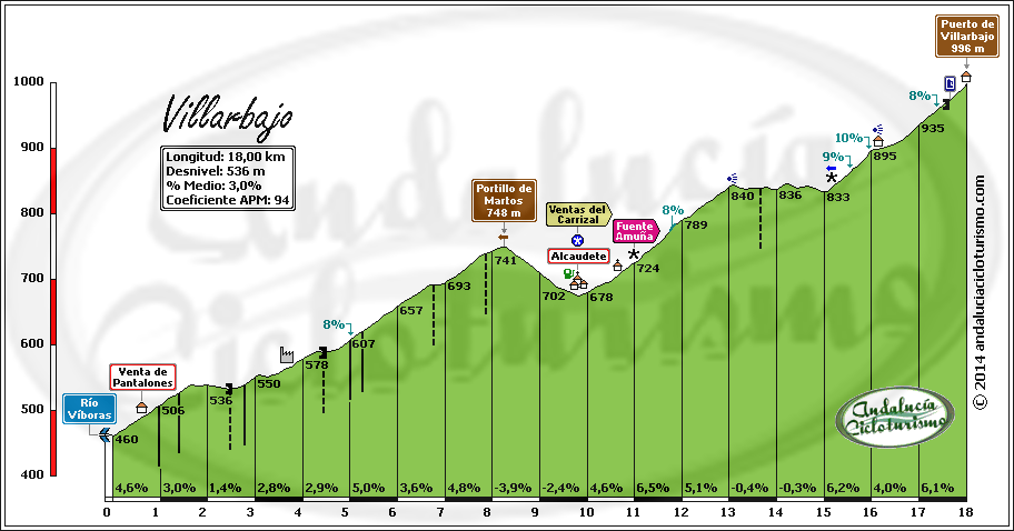 El portillo de Martos, con sus poco más de 8 kilómetros no llega a ser más que una tachuela con alguna rampa suelta, pero sin apenas porcentaje. Podríamos decir que no pasa de mero calentamiento de no ser porque lo que restará después tampoco tiene demasiada chicha. Lo más notable es, sin lugar a dudas, la longitud, que cuando se aproxima a los 20 km. en un puerto, siempre es digno de tener en cuenta por muy suave que éste sea.