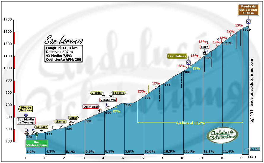 Aunque las comparaciones siempre son odiosas, condideramos que pueden servir para forjarnos una idea aproximada de a qué vamos a enfrentarnos y, en este caso, es justo decir que nos vamos encontrar con algo así como La Marmolada (el Passo Fedaia dolomítico) asturiana, ya que los 6 kilómetros finales de San Lorenzo cuentan con unos números similares en lo que a pendiente se refiere al coloso italiano. Éste, no obstante, gana el duelo por contar con una zona inicial algo más larga y ligeremente más dura y, sobre todo, por su altitud, que supera los 2.000 m.