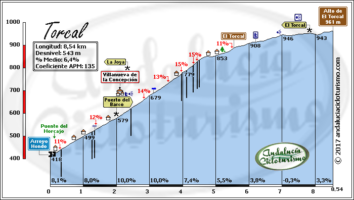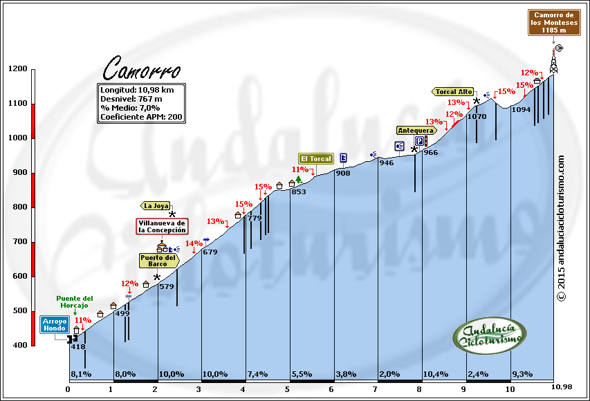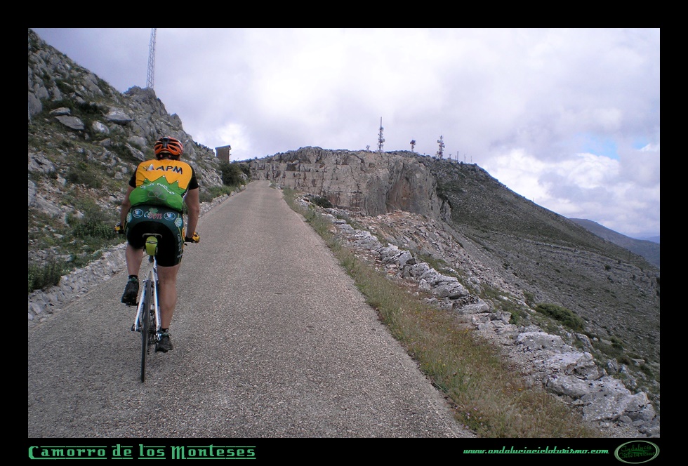 Desde luego, el ascenso en bicicleta, a menos que vayamos advertidos de su dureza, tampoco nos va a dejar indiferentes, máxime cuando a la mencionada belleza del paraje sumemos la tremenda dificultad de sus rampas. Si acaso, puesto que la Vuelta Ciclista a Andalucía ha incluido el alto en distintas ediciones -en muchos casos como punto cuasi culminante de la carrera- nos sonará como puerto de primera categoría. Pero lo cierto es que hasta su cima, desde donde no encontraremos salida, continúa la carretera ascendiendo por unas rampas de aupa a base de largas rectas, punto hasta el que efectivamente lo podríamos considerar como tal. Además, como la carretera a poco menos de dos kilómetros de la cima se bifurca hacia las antenas del Camorro de los Monteses, hemos decidido presentar aquí ambos ascensos por su vertiente más dura, la de Villanueva de la Concepción.