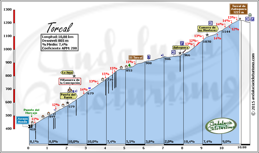 Aunque viniendo desde el sur, en el cogollo de los Montes de Málaga, el camino previo lleva tendencia ascendente -y por la comarca pueden incluirse, además, un sin fin de repechos y puertos como antesala- la franca subida al Torcal la daremos por empezada al atravesar el puente del Horcajo, punto en que las rampas tomarán un cariz más serio.