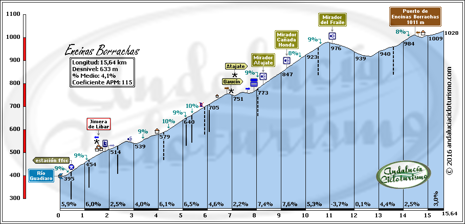 Coronado un altillo llegamos al mencionado cruce, justo a la altura de Atajate, el municipio con menor número de habitantes de la provincia malagueña. A partir de aquí afrontamos la última parte del ascenso, la de mayor dificultad, con unos tres kilómetros entre el 8% y el 6% por una carretera que hace unos años ha sido completamente reparada y aderezada con numerosos miradores que nos permiten contemplar con total tranquilidad la grandeza paisajística del Valle del Genal, lo que le ha valido el sobrenombre de la “carretera de los miradores”. Así, camino de Algeciras, en el puerto del Espino tenemos, por ejemplo, el “Mirador del Guadiaro” con vistas al valle homónimo, en dirección a Ronda el “Mirador del Fraile”, en referencia a Fray Leopoldo de Alpandeire y con vistas a esta hermosa localidad.