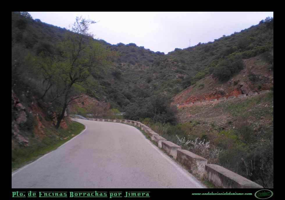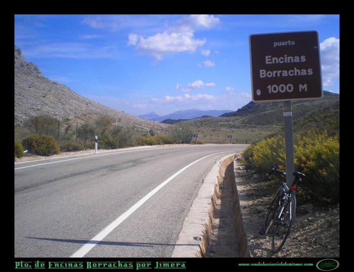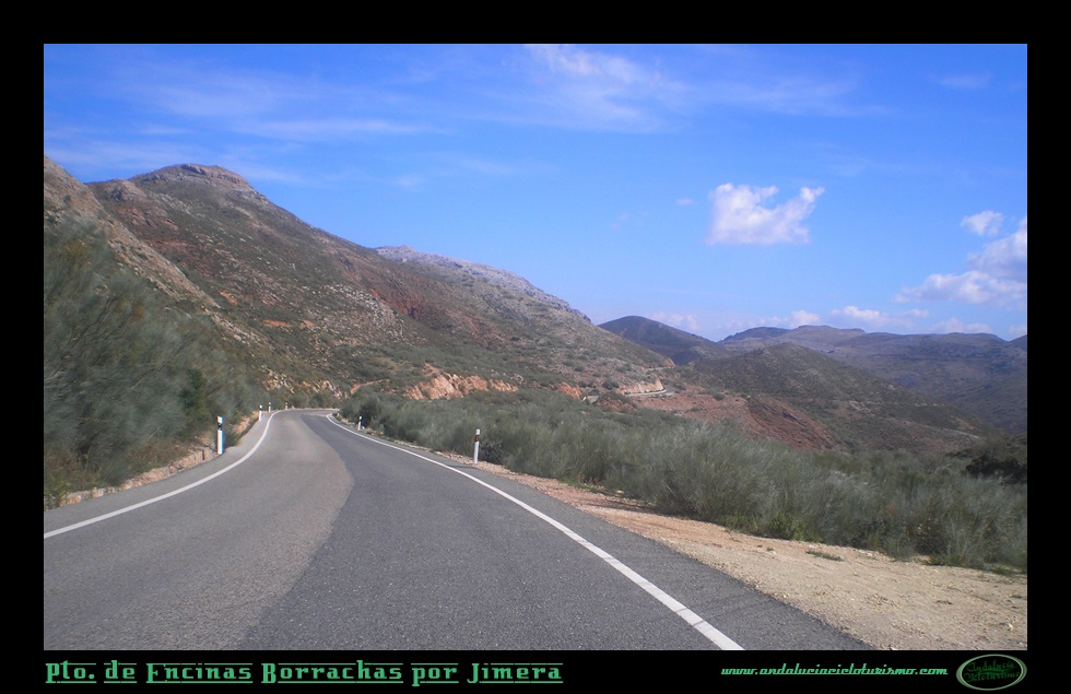 Tras algo más de un kilómetro y medio de descenso, retomamos la subida, mucho más liviana, hasta coronar el collado natural, trecho final que nos permitirá dedicarnos al “ciclismo contemplativo”. Coronamos el puerto de Encinas Borrachas a poco más de 1.000 m. sobre el nivel del mar (1.000 m. señala el cartel de la cima) en una zona despoblada de vegetación (de hecho así lo viene siendo desde hace ya varios km.) y continuamos, después de un nuevo y breve descansillo, en suave ascenso hasta el punto más alto de esta hermosa carretera situado a 1.028 m.