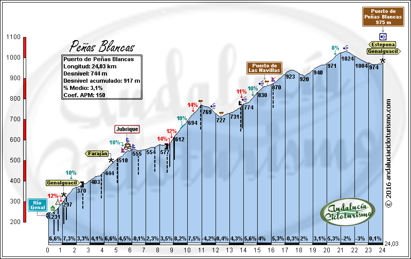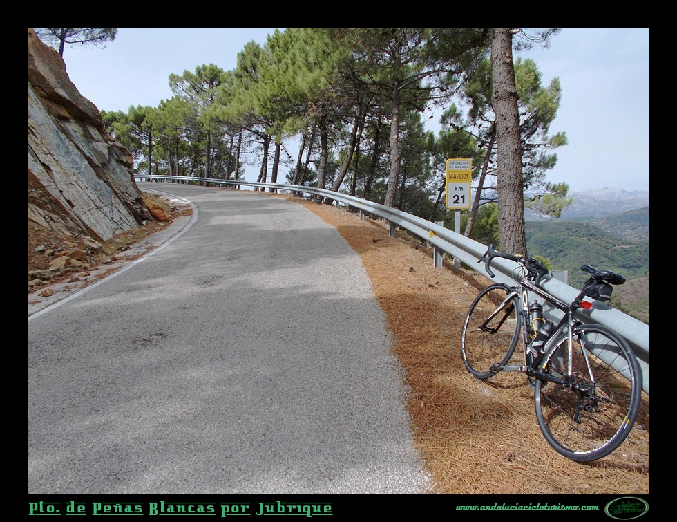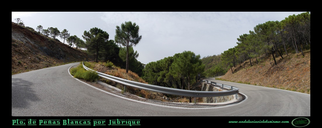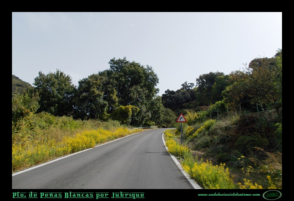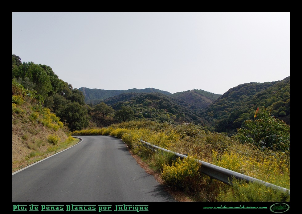 Las apacibles aguas del río Genal, casi sin tiempo de concluir el descenso del revirado puerto del Espino, señalan el inicio de este larguísimo puerto de Peñas Blancas, camino de Jubrique y, más allá aún, de la localidad costasoleña de Estepona. Serán 24 km. hasta el puerto natural, tres menos hasta el punto más alto de la carretera, el Porrejón, en los que lo único constante será la irregularidad del puerto. Bueno, eso y el continuo curveo.