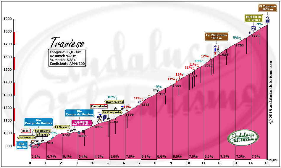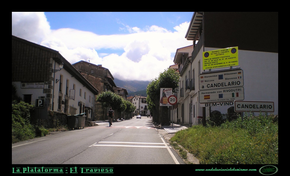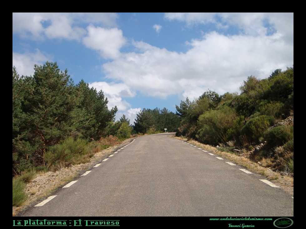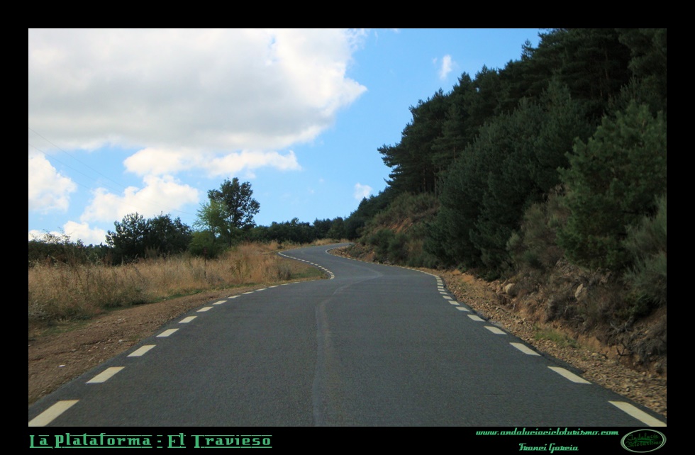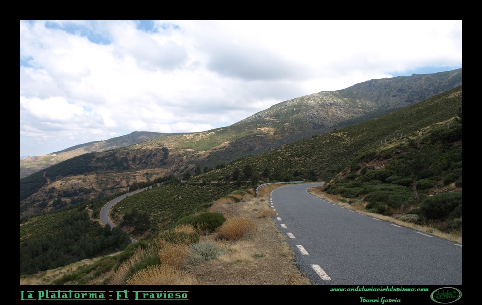 Aunque de una dureza global muy similar a su vecino de la Covatilla, El Travieso es un puerto más amable por sus rampas y de una notable belleza -muy superior en nuestra opinión en este sentido-, introduciéndose de pleno en la Reserva Natural la Biosfera de Candelario (que se postula para Parque Natural) más afín por ello también a la filosofía cicloturista. La carretera sube paralela a la de la Covatilla, aunque resulta completamente diferente, sobre todo por la espesa vegetación que nos acompaña curva tras curva hasta la Plataforma. La arboleda nos transmite la agradable sensación de encontrarnos en una zona de alta montaña, por más que en su tramo final hasta El Travieso se despueble.