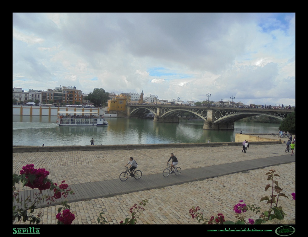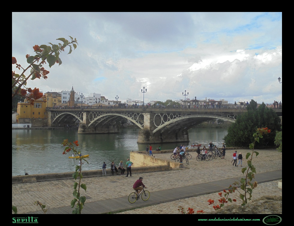 Tras rodearlo, salimos de la Plaza Nueva hacia la de la Magdalena por la C/Méndez Núñez ya con tráfico abierto. Desmontamos durante unos instantes para evitar ir en dirección prohibida y pronto, por la C/San Pablo saldremos a Reyes Católicos (una incursión gastronómica por el barrio del Arenal siempre es recomendable) hasta desembocar en el Guadalquivir a la altura del puente de Isabel II, también conocido como puente de Triana. Sustituyendo al antiguo puente de barcas que unía la ciudad con el famoso barrio, la obra (erróneamente atribuida al ingeniero Eiffel, aunque realizada por dos colegas franceses a imitación de un puente sobre el Sena) es a día de hoy el puente de hierro más antiguo conservado en el país (1852) y desde luego uno de los principales blancos de las cámaras fotográficas de los turistas que pasean por la ribera del río.