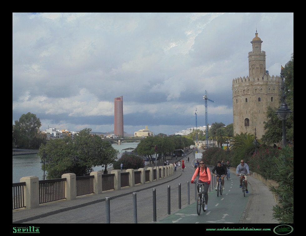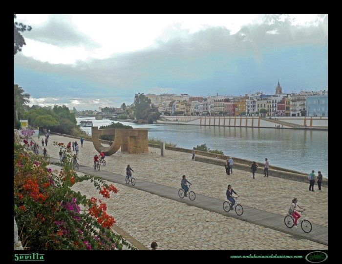 Una segunda opción sería la de atravesar el puente y prolongar la visita dando un paseo por el barrio de Triana; y una última opción sería la de girar a la derecha y, sirviéndonos del más antiguo tramo de carril bici de la ciudad, el que paralelo al río nos conduce hasta el Parque del Alamillo, prolongar la ruta varios kilómetros más de ida y vuelta.