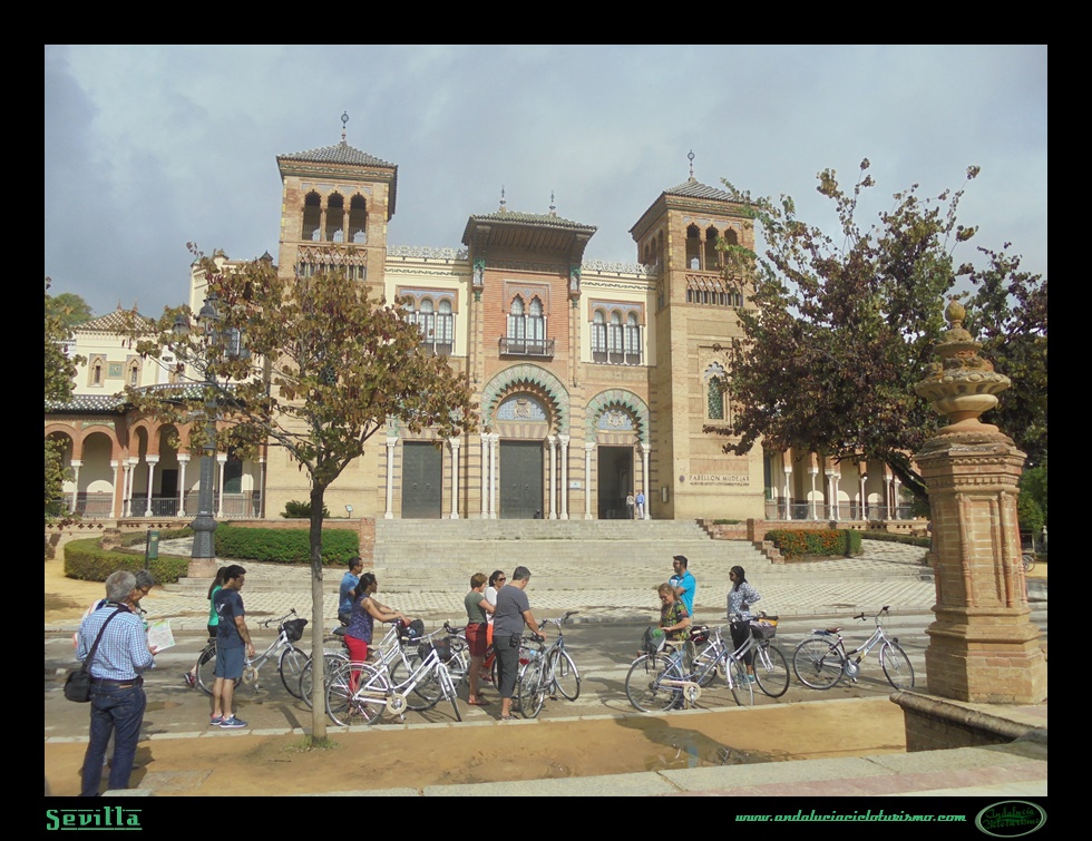 Quizás el único lugar donde eso era posible antes de la ciclísticamente renovada Sevilla es el sitio donde hemos decidido comenzar nuestro paseo de hoy: el Parque de Maria Luisa. Entre la algarabía y las risas de los críos jugando y colmando de arvejón un suelo abarrotado de palomas, la plaza de América con el Museo Arqueológico (neorenacentista), el de Artes y Costumbres (neomudéjar) y el Pabellón Real (neogótico) conserva hoy día el encanto que pudiera poseer el día de la inauguración de la Exposición Iberoamericana de 1929 para el que fueron levantados por Aníbal González entre 1913 y 1916.