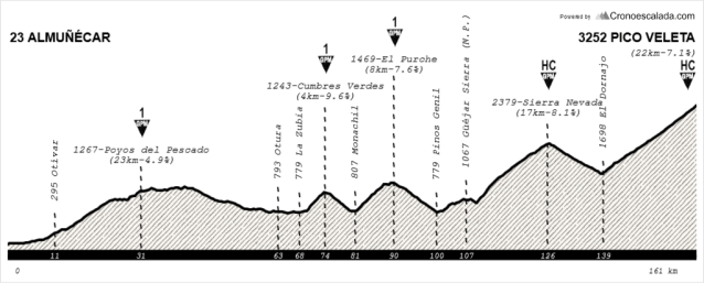 Empezamos en Almuñécar, al nivel del mar, para acabar a casi 3.300 m. de altitud en 161 km. de recorrido, ascendiendo entre medias un total de cinco puertos, de los cuales tres serían de primera categoría y un par de ellos de categoría especial, para superar más de 6000 m. de desnivel acumulado. Alguna licencia -mínima- nos vamos a tomar, como ya explicaremos, por no decir que tampoco está muy claro el lugar donde ubicar la meta más allá de Borreguiles, problema que deberá resolver la organización de La Vuelta, si finalmente empeñan en llegar a la cumbre granadina.