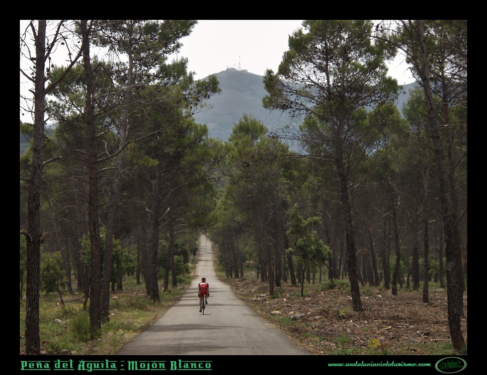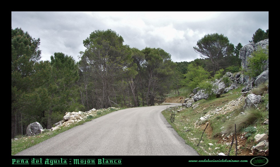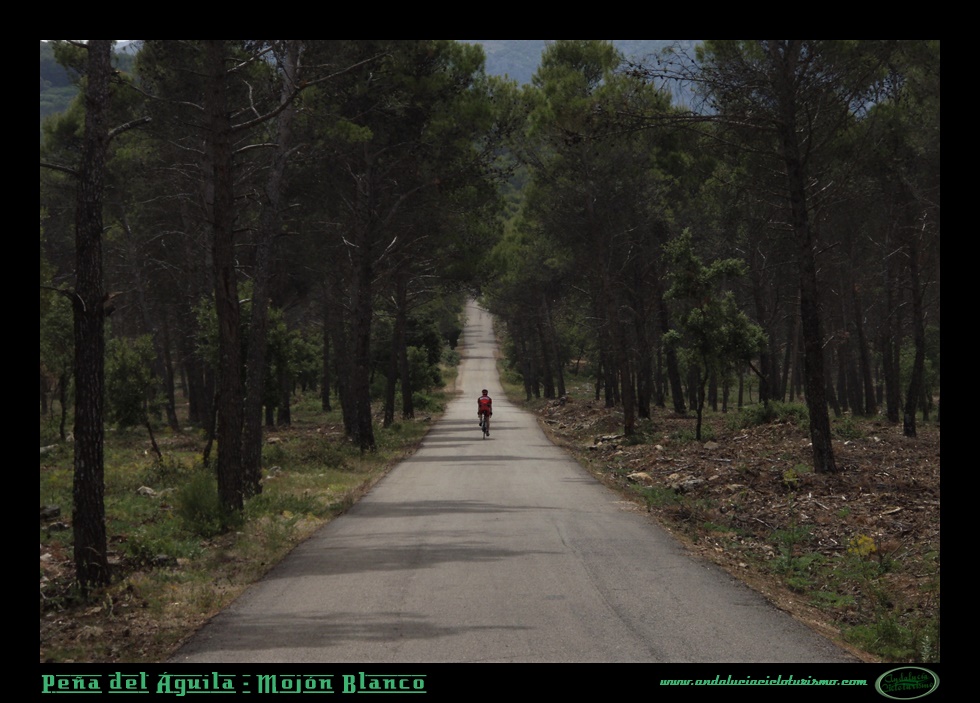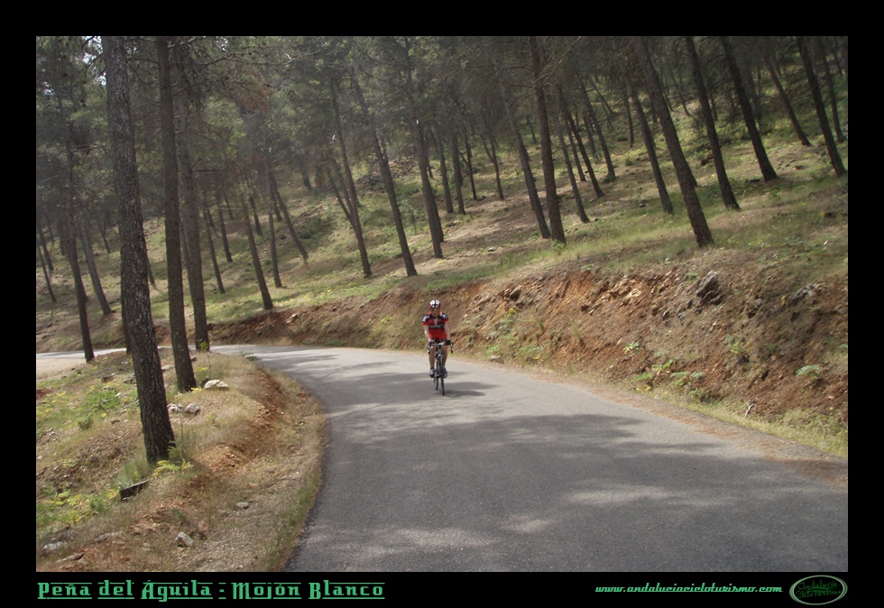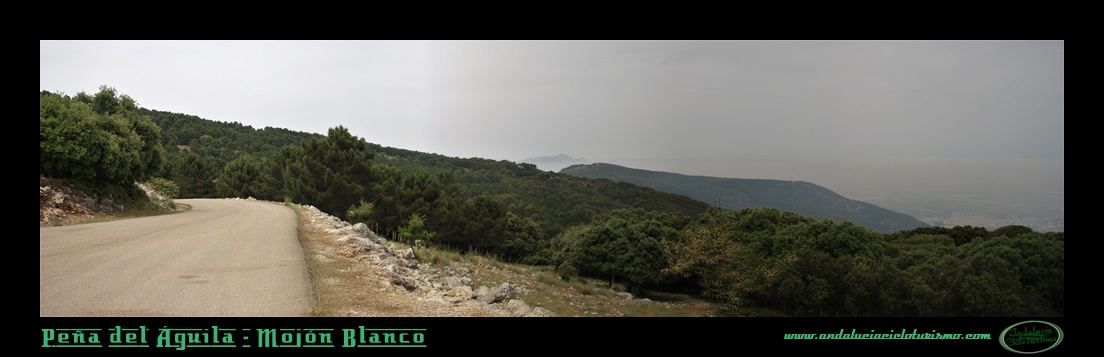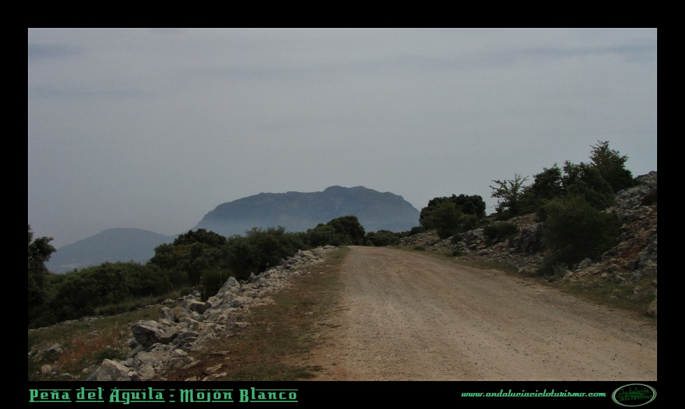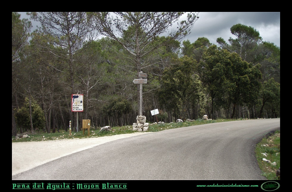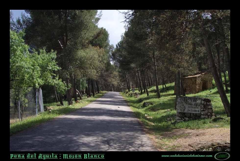 A la derecha un cartel nos indica que nos hallamos en el monte “Peña del Águila” y nos informa sobre la repoblación del lugar. Precisamente con el nombre de Peña del Águila es conocida esta subida inicial que nosotros hemos preferido denominar como “Mojón Blanco” por ser el cerro más próximo a la cima en que acaba el asfalto. Este paraje, además, está catalogado como Zona de Especial Conservación y se postula como candidato a formar parte de la futura ampliación del Parque Natural por el que se puede transitar en cotas más altas en el caso de seguir ascendiendo por la pista de tierra del Almadén.