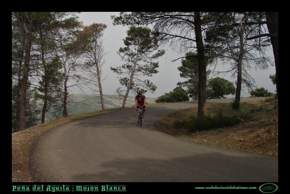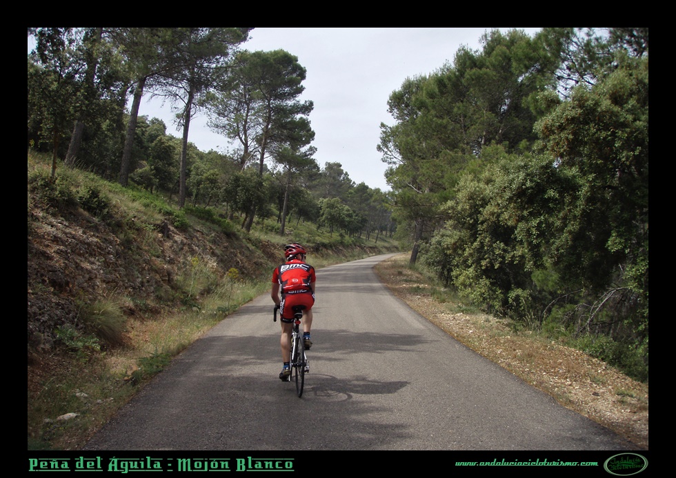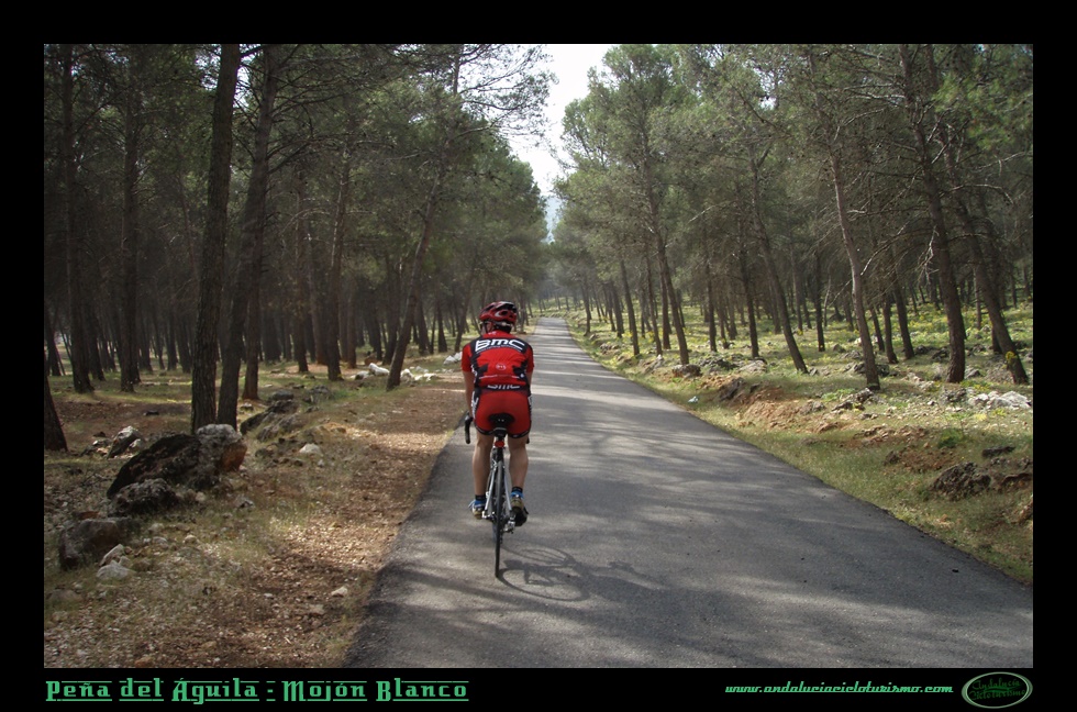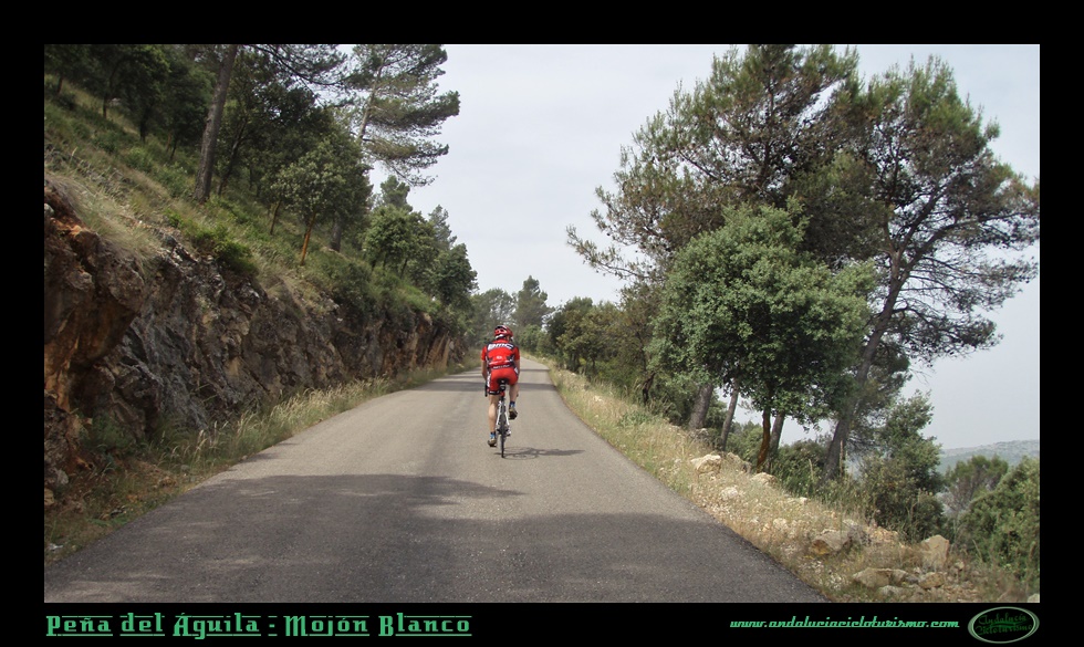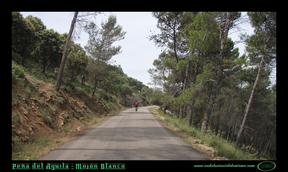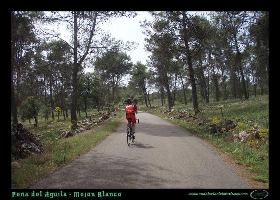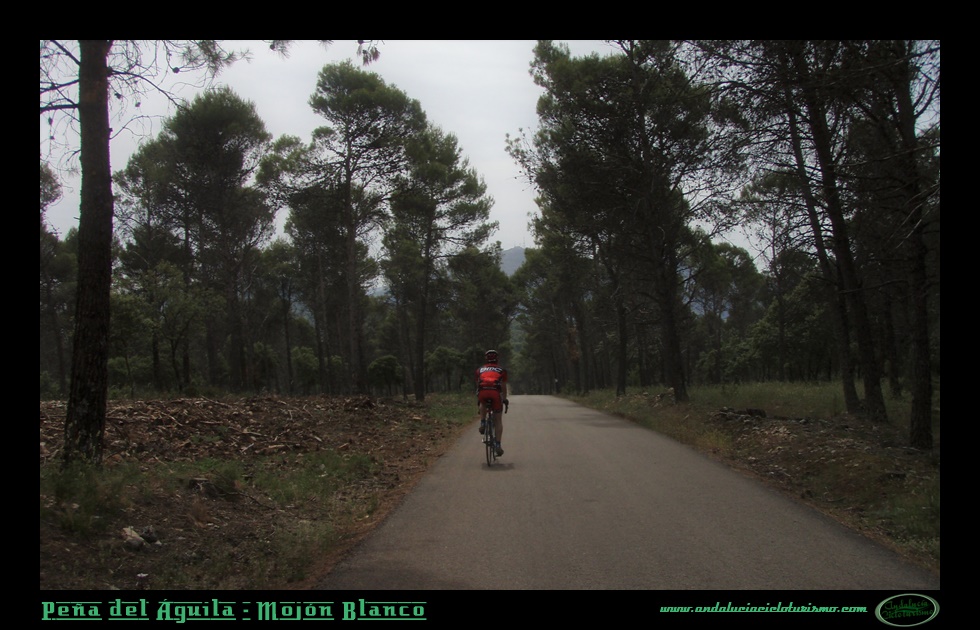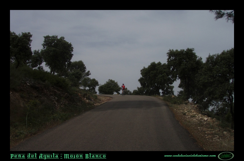 A la derecha un cartel nos indica que nos hallamos en el monte “Peña del Águila” y nos informa sobre la repoblación del lugar. Precisamente con el nombre de Peña del Águila es conocida esta subida inicial que nosotros hemos preferido denominar como “Mojón Blanco” por ser el cerro más próximo a la cima en que acaba el asfalto. Este paraje, además, está catalogado como Zona de Especial Conservación y se postula como candidato a formar parte de la futura ampliación del Parque Natural por el que se puede transitar en cotas más altas en el caso de seguir ascendiendo por la pista de tierra del Almadén.
