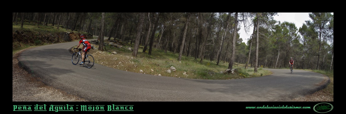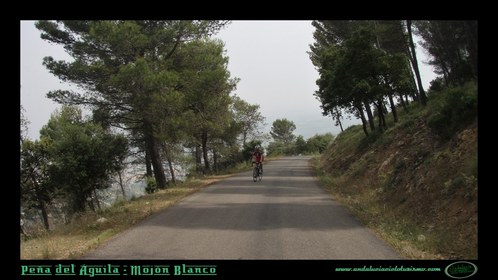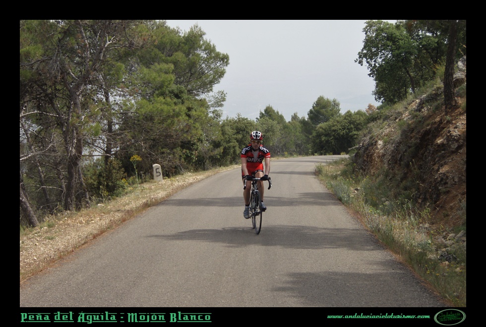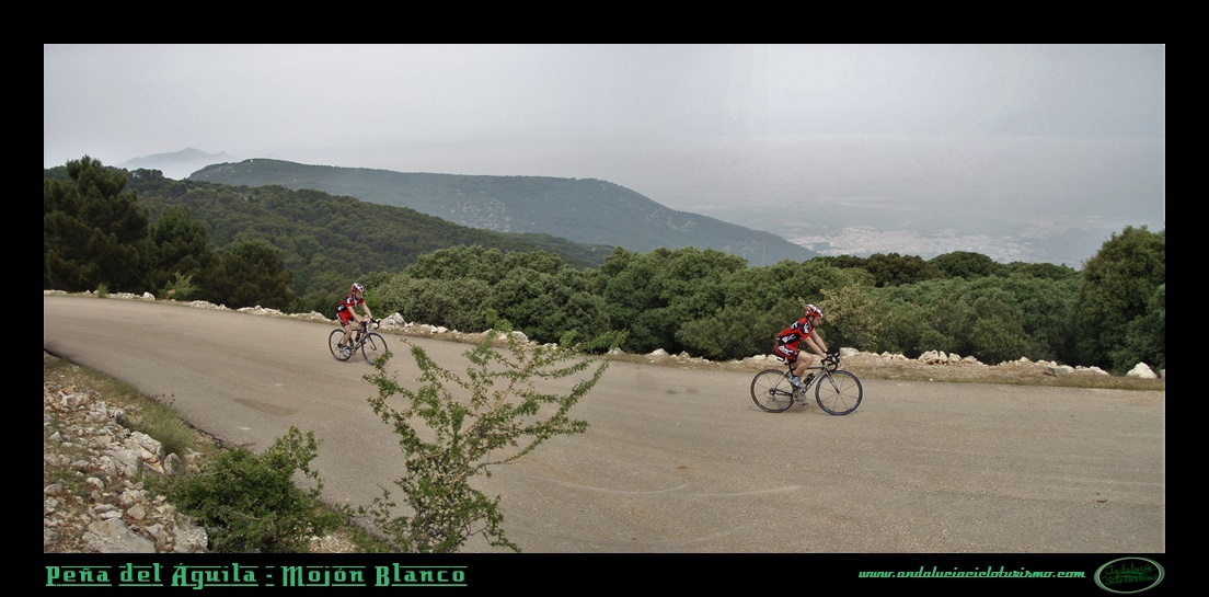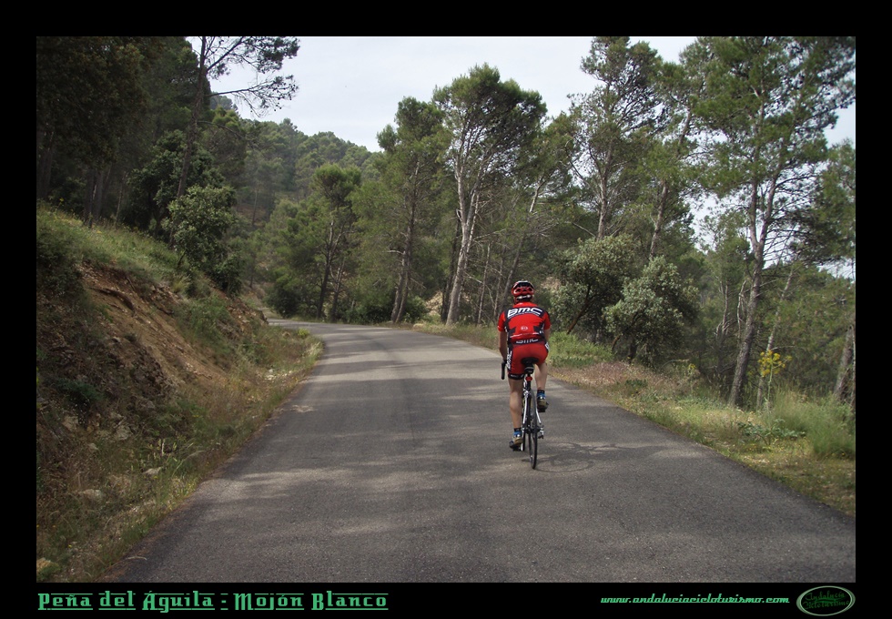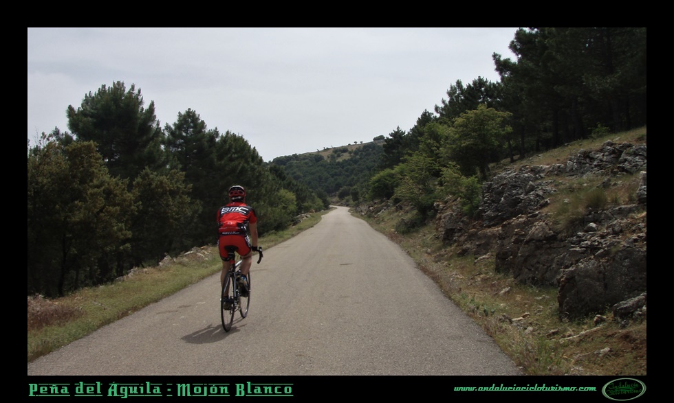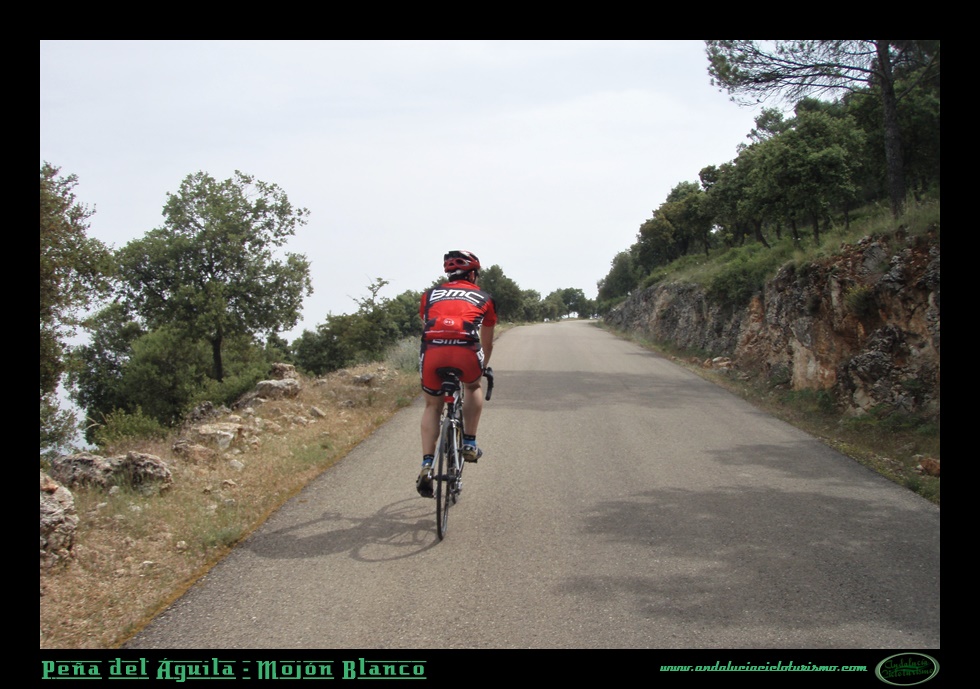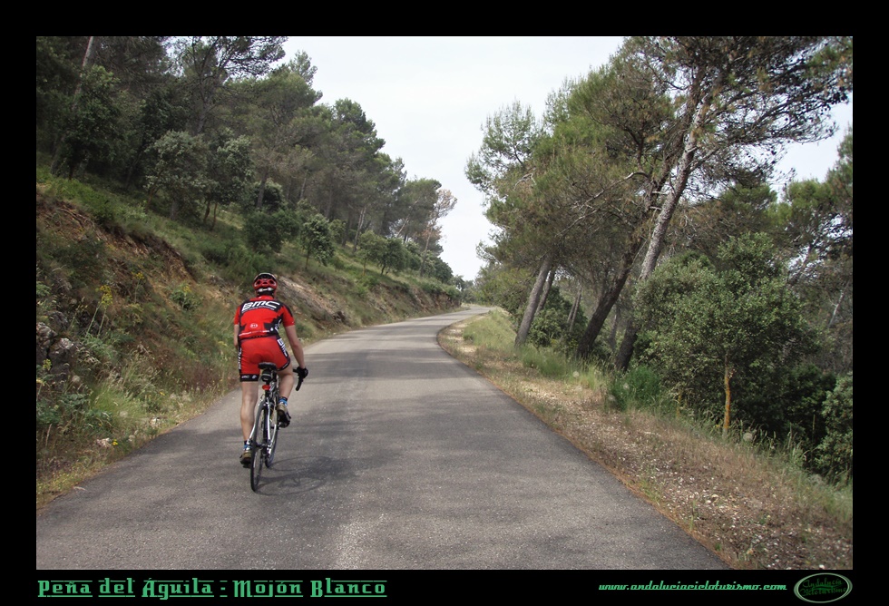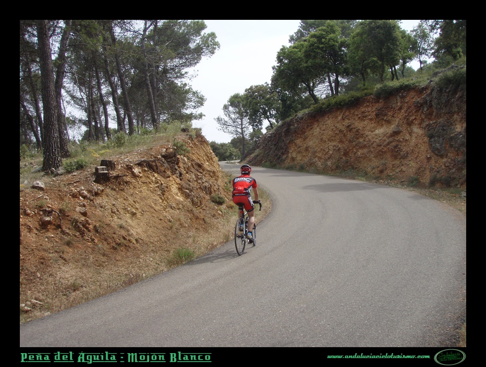 A la derecha un cartel nos indica que nos hallamos en el monte “Peña del Águila” y nos informa sobre la repoblación del lugar. Precisamente con el nombre de Peña del Águila es conocida esta subida inicial que nosotros hemos preferido denominar como “Mojón Blanco” por ser el cerro más próximo a la cima en que acaba el asfalto. Este paraje, además, está catalogado como Zona de Especial Conservación y se postula como candidato a formar parte de la futura ampliación del Parque Natural por el que se puede transitar en cotas más altas en el caso de seguir ascendiendo por la pista de tierra del Almadén.