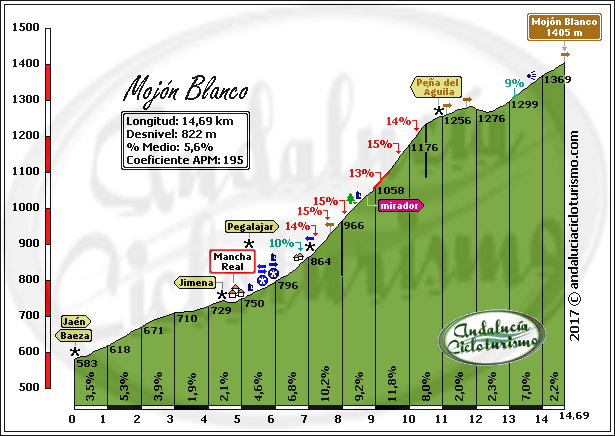 El inicio del puerto, la verdad, es poco halagüeño: la carretera asciende hasta el pueblo por el omnipresente olivar jiennense. Sin rampas de referencia, lo único notable es el volumen de tráfico que habremos de padecer. Y es que Mancha Real es uno de los municipios más prósperos de Andalucía, ya que cuenta no sólo con una evidente industria oleícola, sino también con una maderera, otra de maquinaria e incluso otra relacionada con el incipiente mundo de la informática, por lo que el trajín de coches inicial está asegurado.