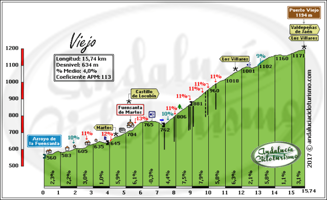 Un descenso nos reconduce hacia la carretera de Valdepeñas, dejando nuevamente la entrada a Fuensanta a nuestra derecha. Al pasar un puentecillo y una herradura a izquierdas, la carretera va adquiriendo un nuevo cariz: desde aquí y por algo más de tres kilómetros, tendremos que afrontar una cuesta continuada y siempre entre el siete y el ocho por cien. Varias curvas adornarán el trazado de un puerto que poco a poco va remontando el valle dejando el pueblo encajonado en su parte media-baja con el telón de fondo de la Sierra de Ahíllos en un horizonte de color aceituna.