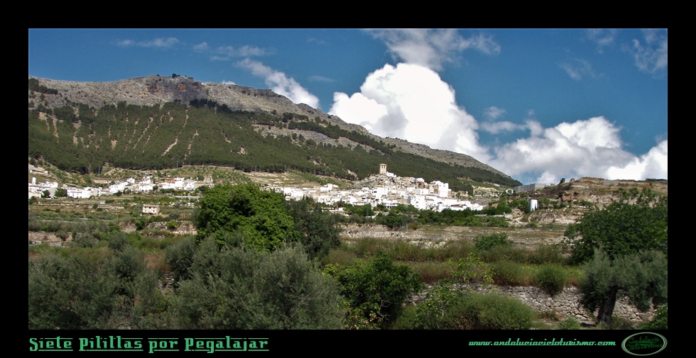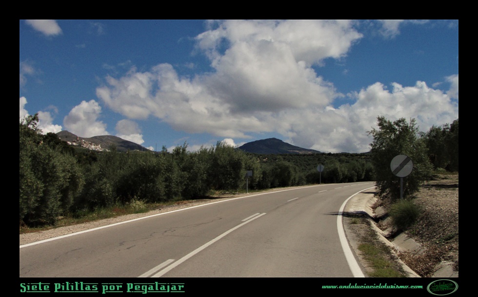 Poco antes del cruce de Pegalajar habrá cejado la pendiente de nuevo, que no la recta. Nos planteamos, no sin dudas, desviarnos por el pueblo para evitar esta monotonía, aunque finalmente nos decidimos por continuar por la variante exterior y evitar, así, el tráfico que, a buen seguro, nos íbamos a encontrar en la travesía del pueblo… Tal vez haya sido un error, pues probablemente no haya tanto tráfico como supusimos y el trazado del puerto parece algo más divertido, a más de permitirnos disfrutar de una vista cercana de la población y su entorno.