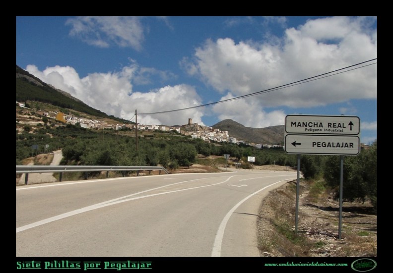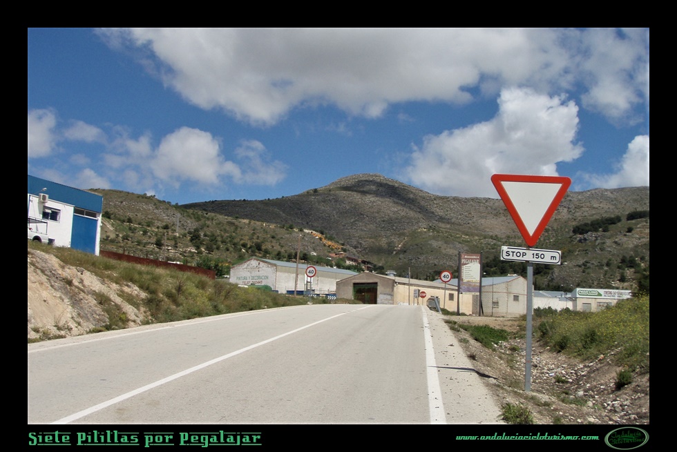 Luego, la carretera empieza a empinarse y a trazar un giro a izquierdas junto a unas naves industriales que se encuentran en la parte alta de la población a su salida en dirección Mancha Real. Apenas sí llegamos a rozar la población llegados a este punto, al trazar una primera curva a izquierdas en cruce y una segunda a derechas de la misma guisa. Al salir de esta última herradura, que se puede considerar como tal clase de curva, una barriada de moderna apariencia nos despedirá de Pegalajar casi sin haberla saludado como quien dice.