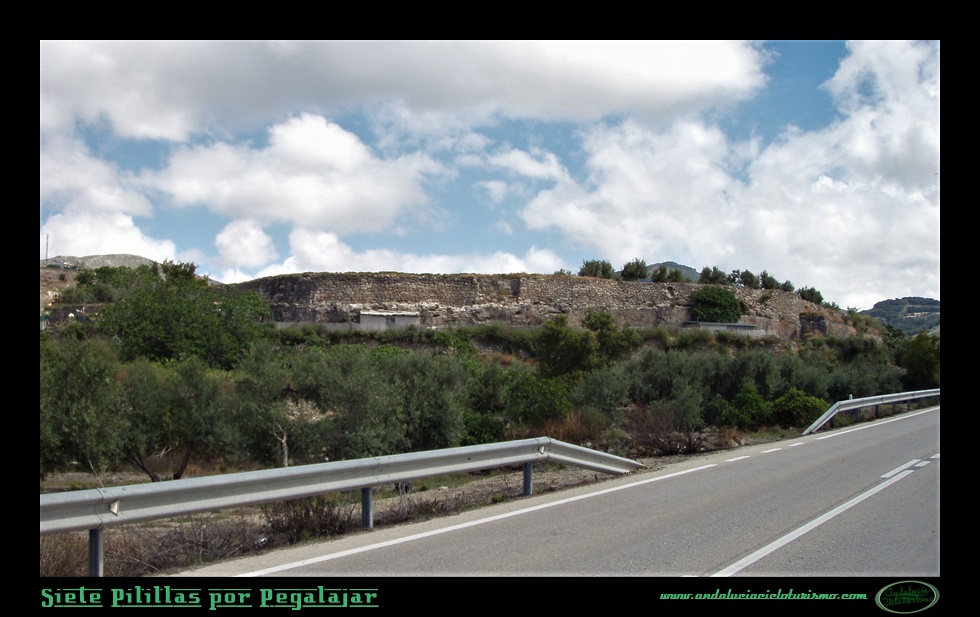 Mas continuamos nuestro pedalear más liviano hasta el inicio del sexto kilómetro. Llama nuestra atención un conjunto de muretes que nuestro ojo profano identifica erróneamente como los restos de una antigua fortificación o sistema defensivo de la población y que no son más que el sostén del eficaz sistema de bancales de la Huerta de Pegalajar. El desarrollo de un sistema de irrigación complejo, no podía deberse a otra cosa que al aprovechamiento humano del terreno. Como es costumbre en otros lugares de Andalucía, la fuerte pendiente de las laderas se aterrazan para ir allanando escalonadamente parcelas del terreno y poder, así, trabajarlo y -sobre todo- regarlo sin que el esfuerzo sea baldío.