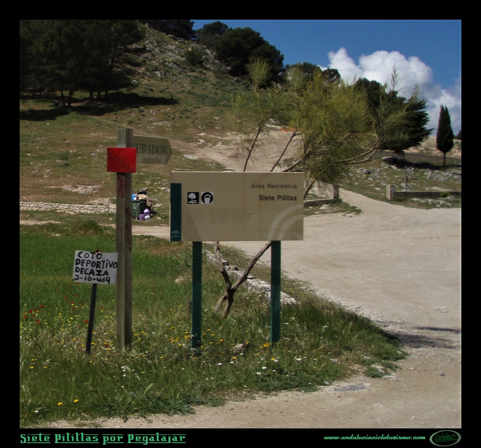 Coronamos en el área recreativa de Siete Pilillas que da nombre al puerto y que, a su vez, lo recibe de una fuente que existe en las inmediaciones de la cima, concretamente a la derecha según hemos coronado y siguiendo un sendero. Dicha fuente cuenta con un abrevadero y siete pilas, una tras otra, aunque habitualmente el agua escasea.