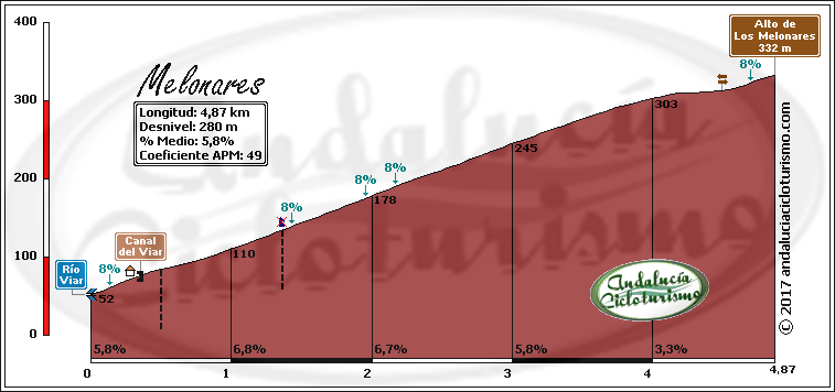 La cuesta de Los Melonares, ubicada en el Parque Natural de la Sierra Norte de Sevilla a unos 50 km. de la capital, es, quizás, la más conocida entre los cicloturistas de Sevilla por ser la ascensión de cierta entidad más cercana a la urbe. Escenario de múltiples “gestas”, suele incluirse en el calendario de todos los clubes de la capital un par de veces al año como mínimo y sus rampas han sido mudo escenario de algunas de las más gloriosas “batallas” dominicales.