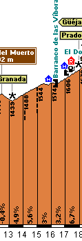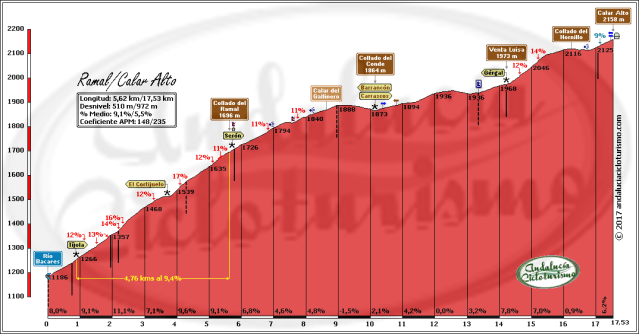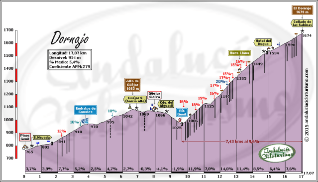 Está previsto el ascenso a Haza Llana como puerto de paso y el ascenso a Sierra Nevada por El Purche. Ahora bien, desde el Purche y una vez se llegue por segunda vez a El Dornajo la organización ha escogido la variante de ascenso más fea, la que continúa por la carretera nueva y no por el Collado de las Sabinas. Nosotros no hemos medido nunca esa variante al soportar tráfico y ser notablemente más fea que la anteriormente mencionada, así que no tenemos datos de ese tramo de subida.