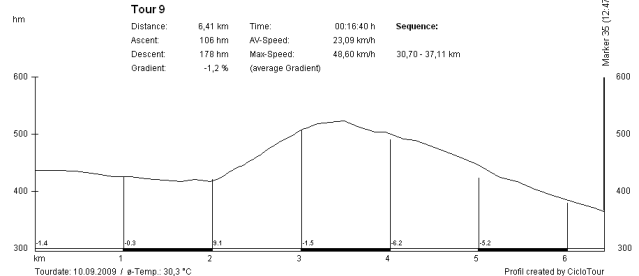 Como puede observarse no se trata de un descenso muy pendiente y, además, está cortado constantemente por repechos. La carretera, aunque sinuosa, está en buen estado.