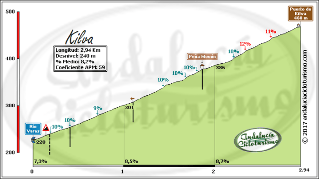 En la A-3001 partiendo del río Varas, punto de inicio también de la vertiente sur del puerto de El Caballón, pero en dirección a Adamuz comienza este corto, aunque duro puerto.
