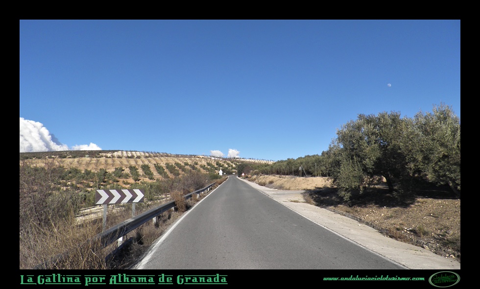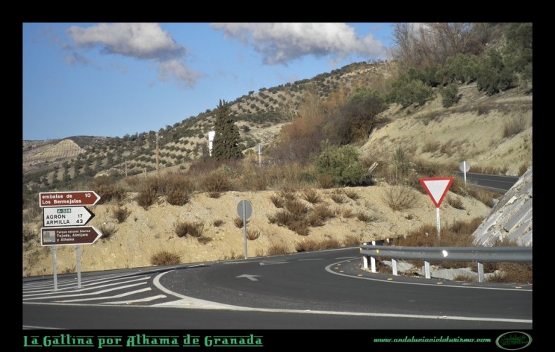Al paso del río, tras un breve rellano, la carretera adquiere una tendencia ascendente que en sus primeras estribaciones va a ser precisamente donde gane la mayor dificultad, nada extraordinario por otra parte. El curveo, tras dejar a nuestra derecha el camposanto, va a dar paso a un tramo remozado de la calzada, más amplia a la par que la cuesta ceja y torna falso llano. Muy pronto giraremos a la derecha en un cruce perfectamente señalizado, con referencia al Embalse de Los Bermejales, Agrón, Armilla y el Parque Natural de las Sierras de Tejeda, Alhama y Almijara.